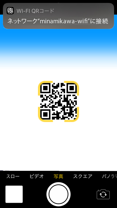iPhoneのカメラアプリケーション(最初からインストールされている標準のカメラアプリケーション)を起動し、ポスター中央のQRコードが画面に表示させてください。すると、画面の上部に「ネットワークに接続する」通知が表示されますので、その通知をタップしてください。