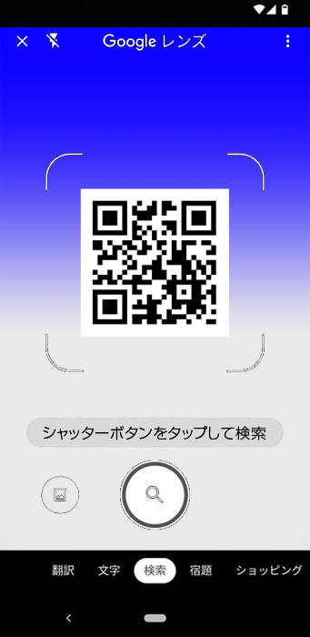 「Googleレンズ」アプリケーションを起動し、ポスター中央のQRコードを画面に表示させてください。QRコードが検知されましたら、虫眼鏡ボタンまたは四角く検知されたQRコードをタップしてください。