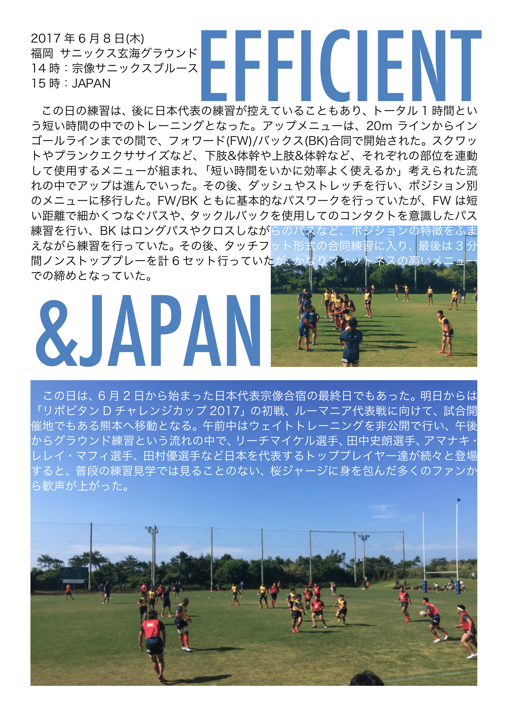 この日は、6月2日から始まった日本代表宗像合宿の最終日でもあった。明日からは「リポビタンDチャレンジカップ2017」の初戦、ルーマニア代表戦に向けて、試合開催地でもある熊本へ移動となる。午前中はウェイトトレーニングを非公開で行い、午後からグラウンド練習という流れの中で、リーチマイケル選手、田中史朗選手、アマナキ・レレイ・マフィ選手、田村優選手など日本を代表するトッププレイヤー達が続々と登場すると、普段の練習見学では見ることのない、桜ジャージに身を包んだ多くのファンから歓声が上がった。