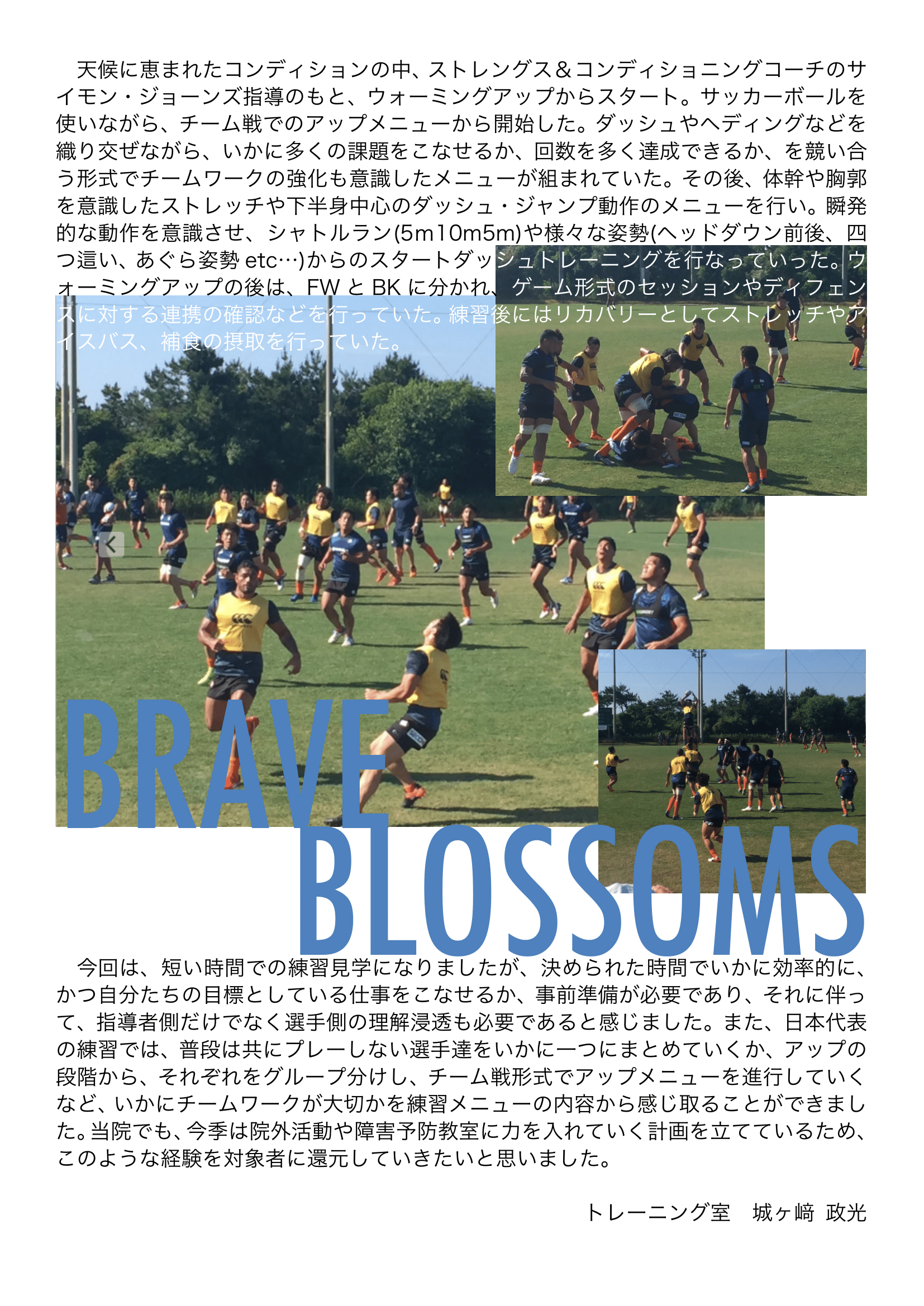 今回は、短い時間での練習見学になりましたが、決められた時間でいかに効率的に、かつ自分たちの目標としている仕事をこなせるか、事前準備が必要であり、それに伴って、指導者側だけでなく選手側の理解浸透も必要であると感じました。また、日本代表の練習では、普段は共にプレーしない選手達をいかに一つにまとめていくか、アップの段階から、それぞれをグループ分けし、チーム戦形式でアップメニューを進行していくなど、いかにチームワークが大切かを練習メニューの内容から感じ取ることができました。当院でも、今季は院外活動や障害予防教室に力を入れていく計画を立てているため、このような経験を対象者に還元していきたいと思いました。