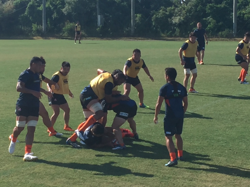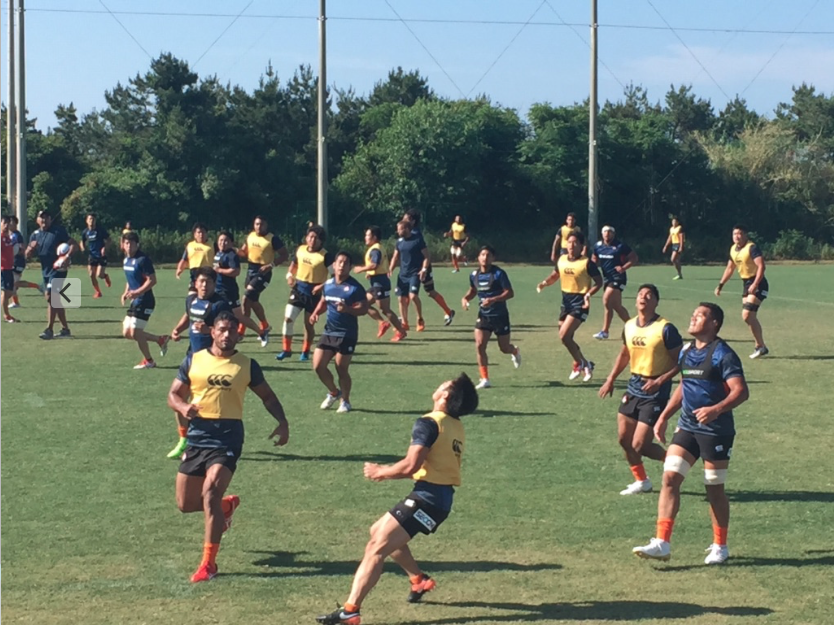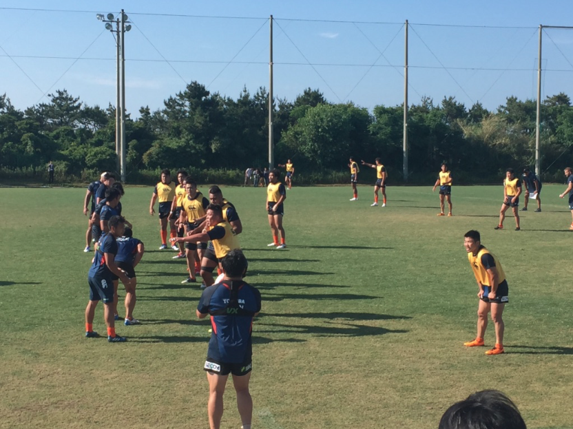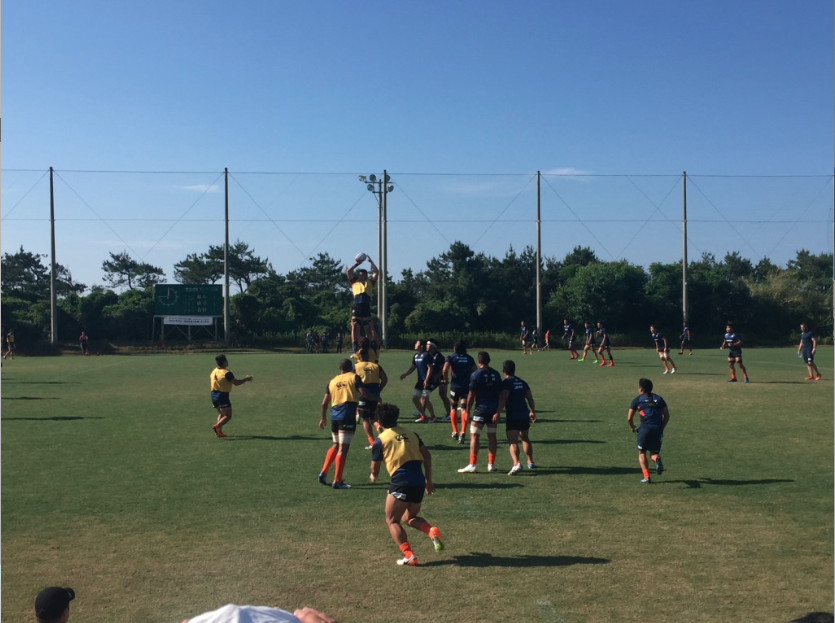 天候に恵まれたコンディションの中、ストレングス&コンディショニングコーチのサイモン・ジョーンズ指導のもと、ウォーミングアップからスタート。サッカーボールを使いながら、チーム戦でのアップメニューから開始した。ダッシュやヘディングなどを織り交ぜながら、いかに多くの課題をこなせるか、回数を多く達成できるか、を競い合う形式でチームワークの強化も意識したメニューが組まれていた。その後、体幹や胸郭を意識したストレッチや下半身中心のダッシュ・ジャンプ動作のメニューを行い。瞬発的な動作を意識させ、シャトルラン(5m10m5m)や様々な姿勢(ヘッドダウン前後、四つ這い、あぐら姿勢etc…)からのスタートダッシュトレーニングを行なっていった。ウォーミングアップの後は、FWとBKに分かれ、ゲーム形式のセッションやディフェンスに対する連携の確認などを行っていた。練習後にはリカバリーとしてストレッチやアイスバス、補食の摂取を行っていた。