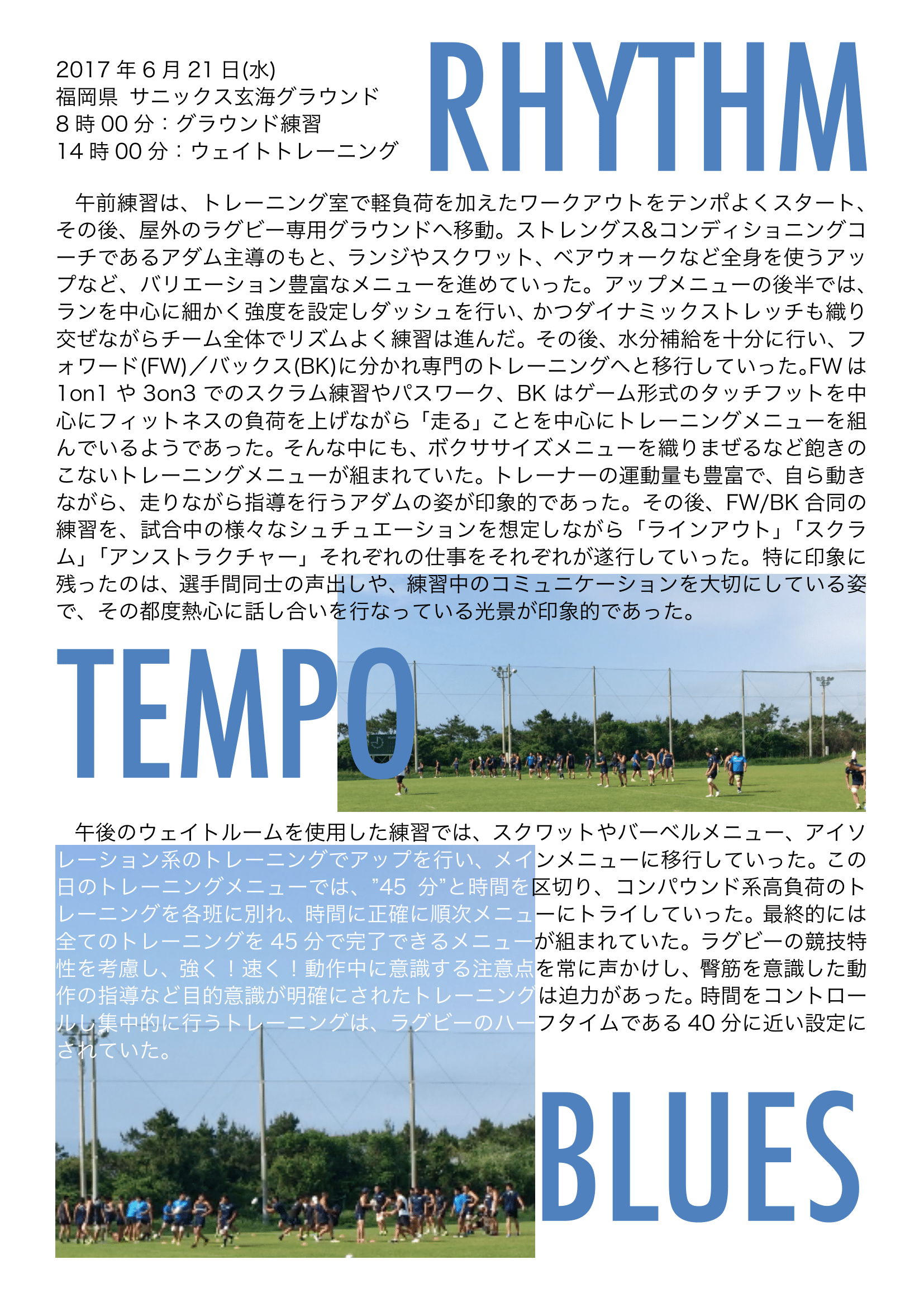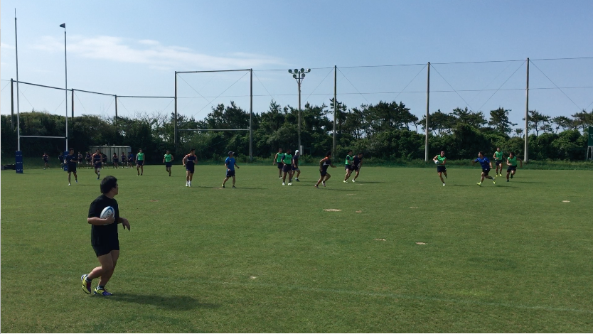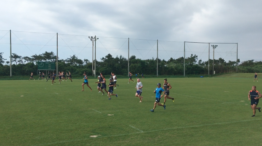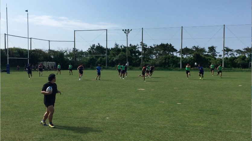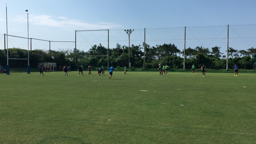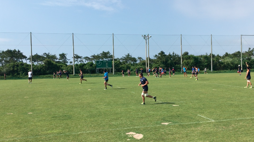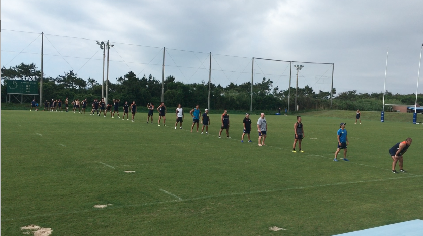 午前練習は、トレーニング室で軽負荷を加えたワークアウトをテンポよくスタート、その後、屋外のラグビー専用グラウンドへ移動。ストレングス&コンディショニングコーチであるアダム主導のもと、ランジやスクワット、ベアウォークなど全身を使うアップなど、バリエーション豊富なメニューを進めていった。アップメニューの後半では、ランを中心に細かく強度を設定しダッシュを行い、かつダイナミックストレッチも織り交ぜながらチーム全体でリズムよく練習は進んだ。その後、水分補給を十分に行い、フォワード(FW)/バックス(BK)に分かれ専門のトレーニングへと移行していった。FWは1on1や3on3でのスクラム練習やパスワーク、BKはゲーム形式のタッチフットを中心にフィットネスの負荷を上げながら「走る」ことを中心にトレーニングメニューを組んでいるようであった。そんな中にも、ボクササイズメニューを織りまぜるなど飽きのこないトレーニングメニューが組まれていた。トレーナーの運動量も豊富で、自ら動きながら、走りながら指導を行うアダムの姿が印象的であった。その後、FW/BK合同の練習を、試合中の様々なシュチュエーションを想定しながら「ラインアウト」「スクラム」「アンストラクチャー」それぞれの仕事をそれぞれが遂行していった。特に印象に残ったのは、選手間同士の声出しや、練習中のコミュニケーションを大切にしている姿で、その都度熱心に話し合いを行なっている光景が印象的であった。