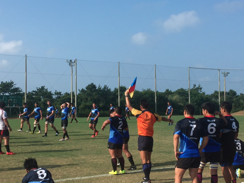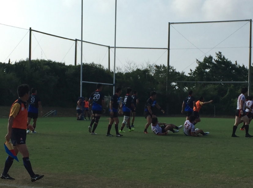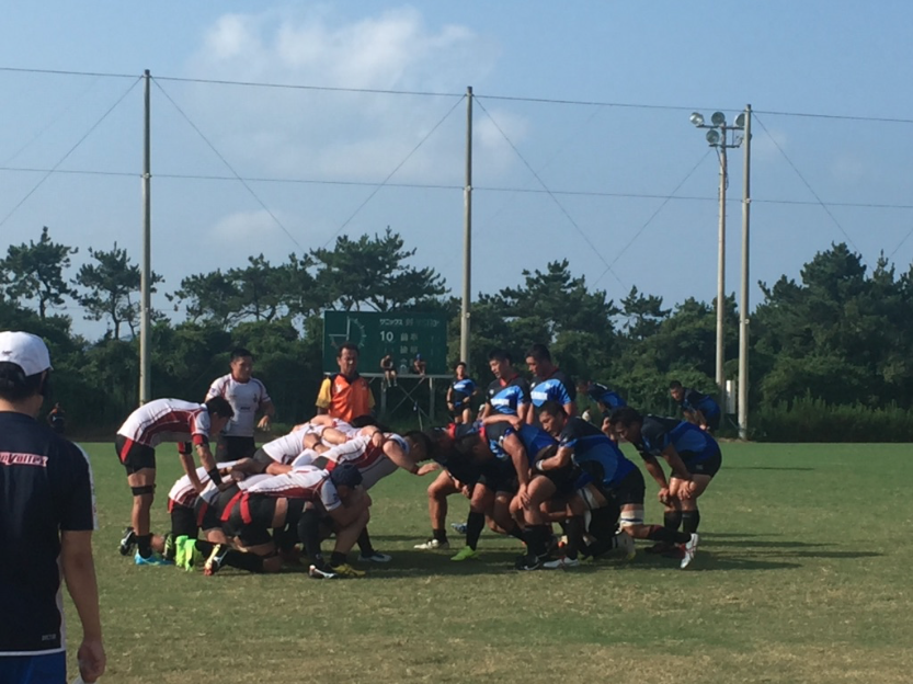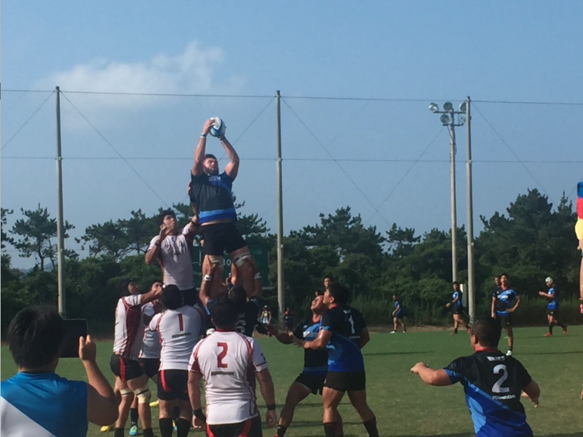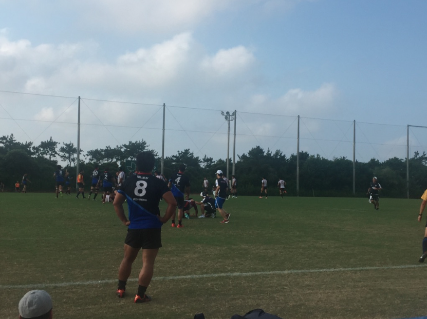 午後16時00分、昨年怪我から復帰したSO村上大記選手のキックオフで試合は始まった。直後の前半4分に元イングランド代表のジェフ・パーリング選手のトライで先制。ファーストトライはチーム全体でボールをつなぎ、最後は期待の新戦力が決めるという最高の形となった。勢いに乗った宗像サニックスは直後の9分にも、すかさず速攻を仕掛け、キックしたボールが吸い込まれるように申選手の手に渡りそのままトライを決めた。試合開始わずか10分で、様々なプレースタイルを披露し観客を魅了したブルースだが、やはり基本は「ランニングラグビーだ」と言わんばかりにグラウンドを縦横無尽に走り回り、猛暑の中疲弊した相手チームに対し、前半終了までアタックを継続した。後半はメンバーを大幅に変更したが、得意の走るラグビーは継続され、エブリンハム選手の華麗なステップワークから、個人技で敵陣突破してのトライで得点を伸ばした。試合中、特に目を引いた光景は、前半で退いた選手がグラウンドの選手に対し常に声をかけ続け、控えの選手は試合のサポートとして常に働き続ける姿であった。失点やミスが発生しても、選手間で前向きな言葉を掛け合いお互いに鼓舞し続け、前を向いて次のプレーに繋げようとする選手の姿だった。今シーズンのトップリーグにかけるチームの意気込みがひしひしと伝わってきた。