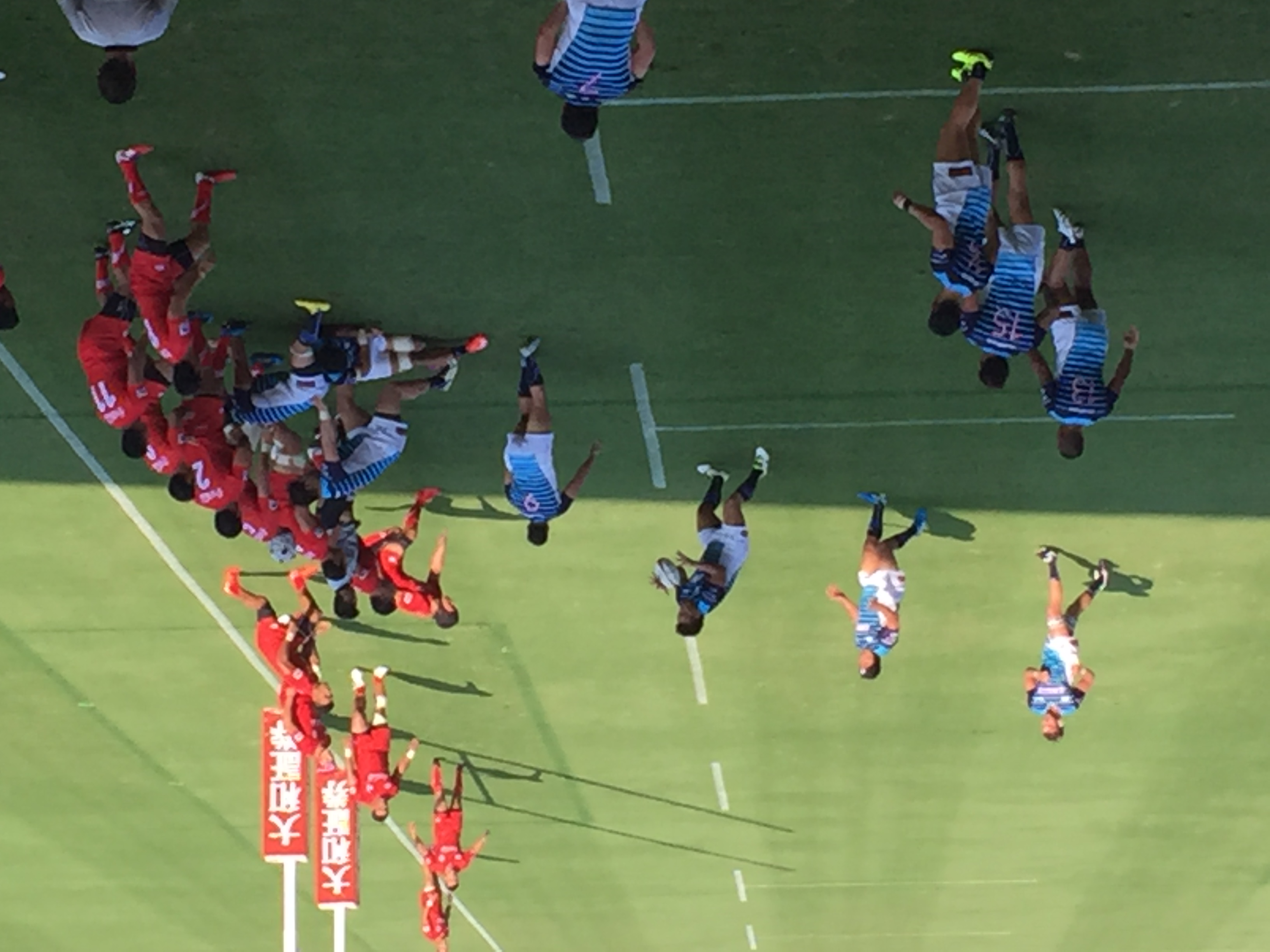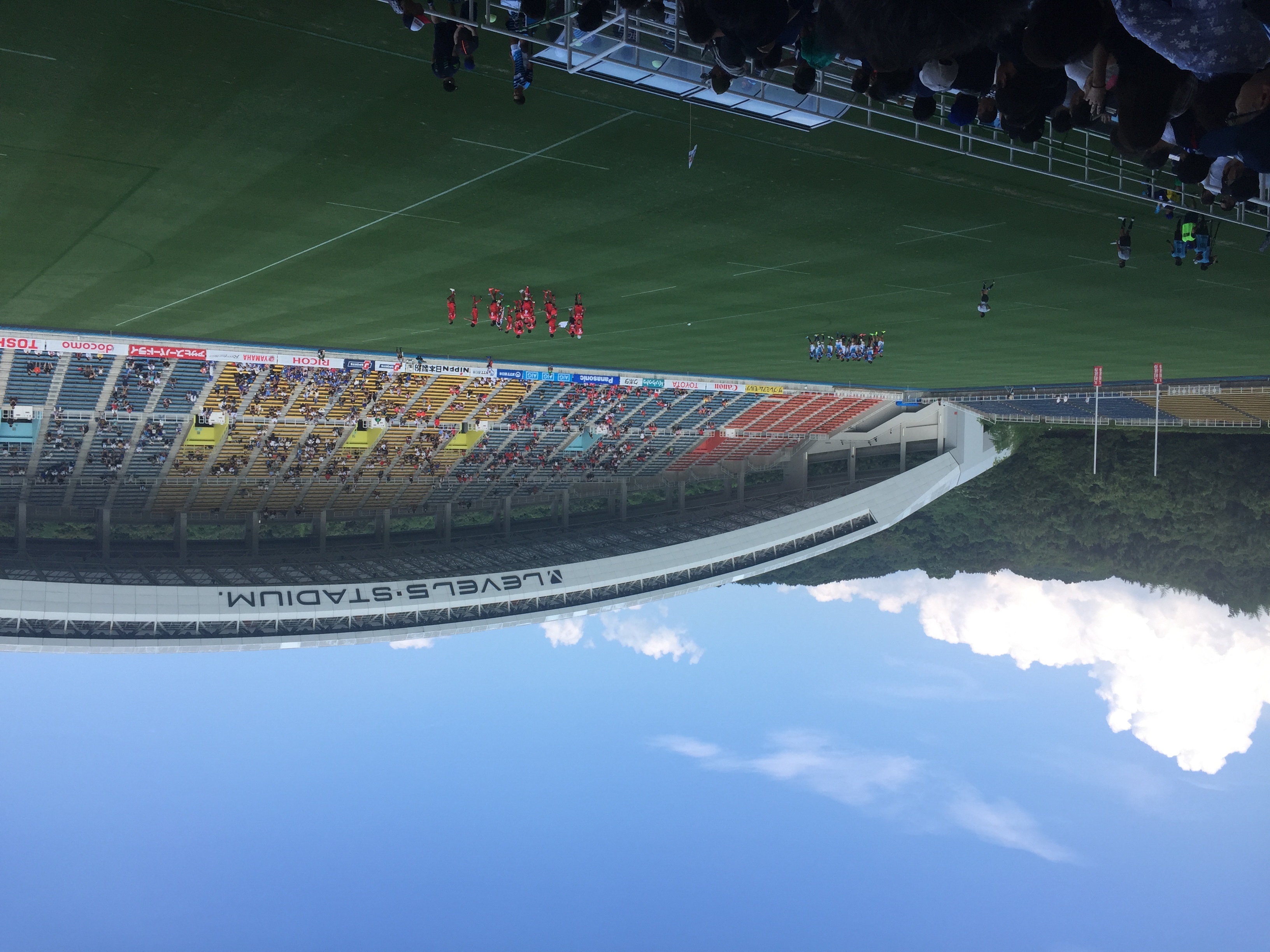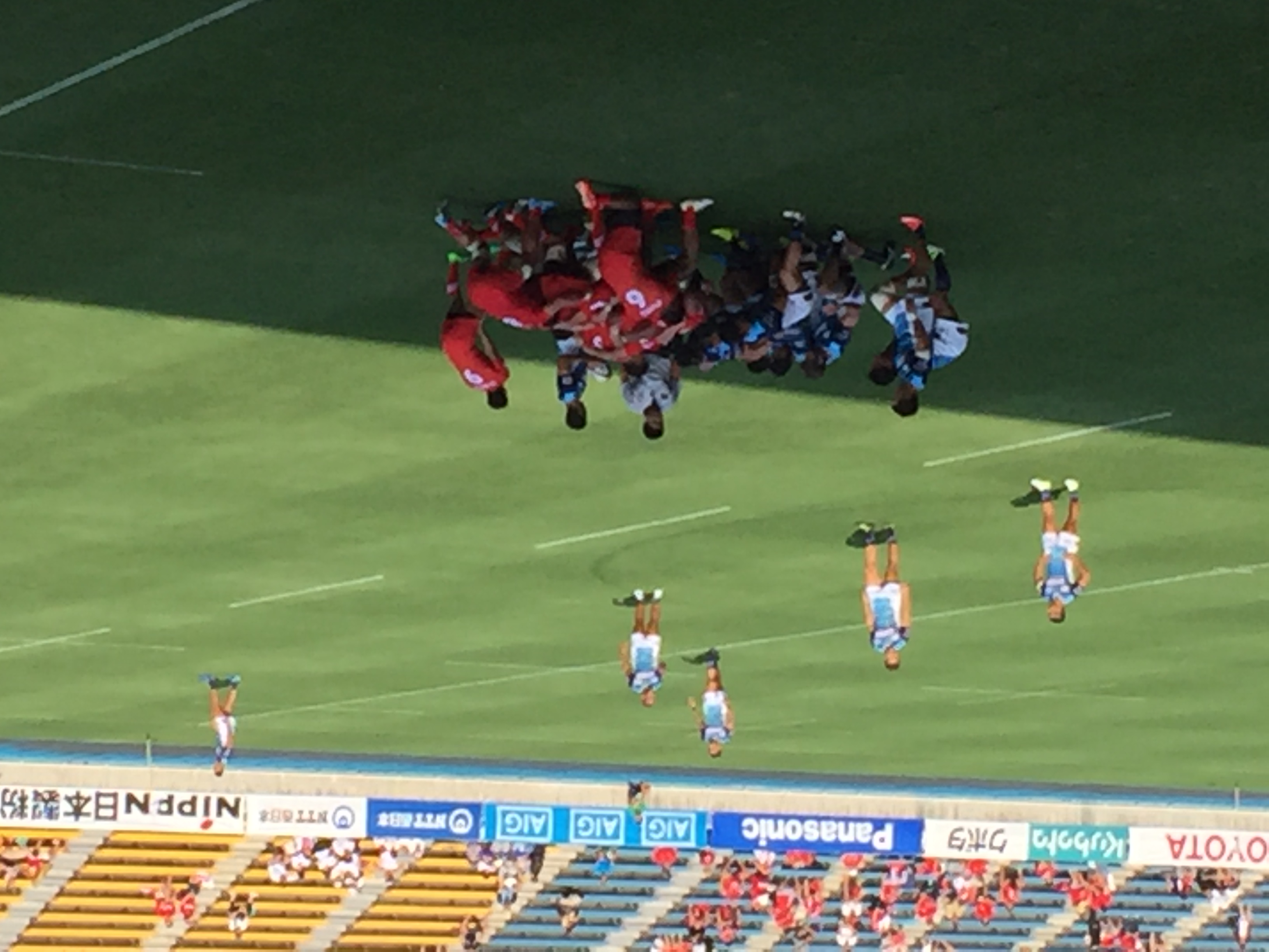あれから半年が経過したレベルファイブスタジアムは、先週のオークランド代表戦とは違い、グラウンド大半に日差しが残り、観戦するスタンドのファンにまで熱中症への注意が喚起されるほど、蒸し暑いコンディションの中での試合となった。今回の試合は、地元チーム同士の「福岡ダービー」ということもあり、メインスタンドは”青”と”赤”のイメージカラーを身にまとったサポーターで、さらなる熱気を帯びていた。