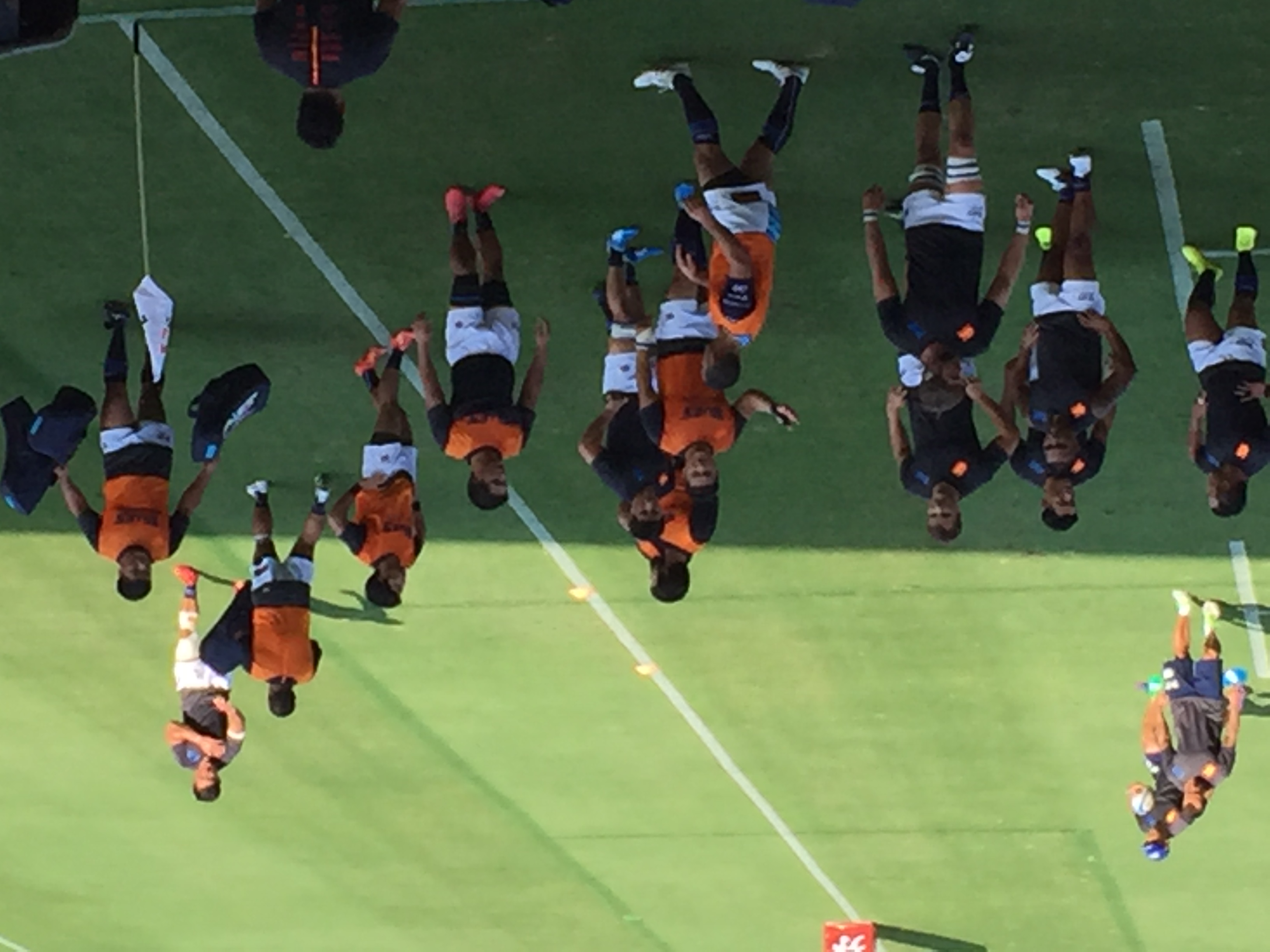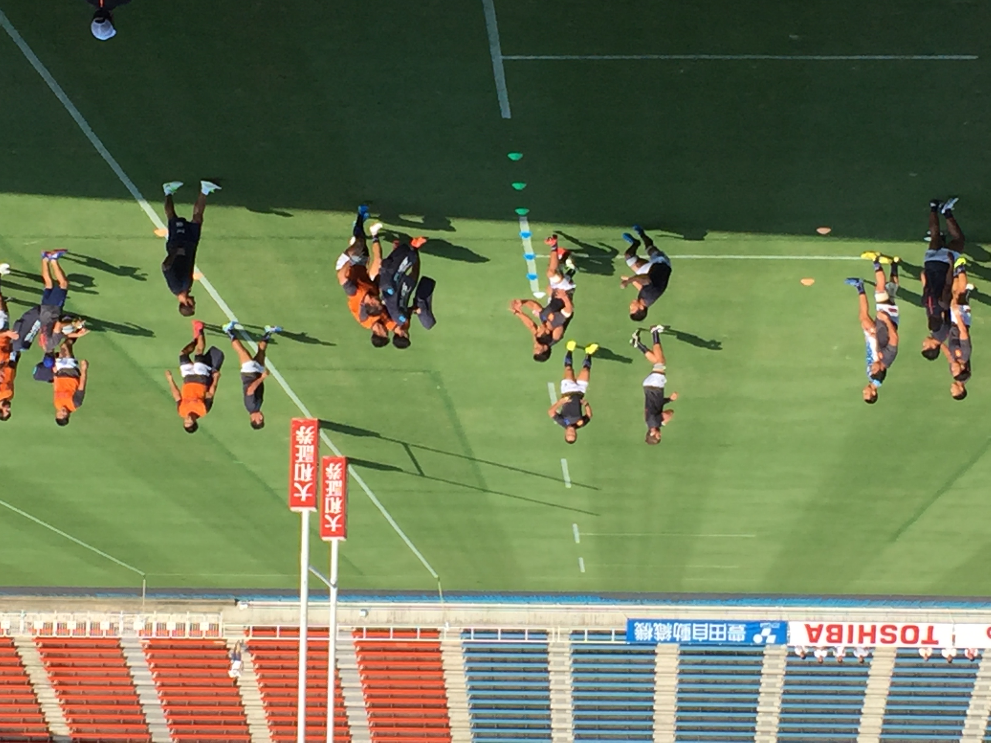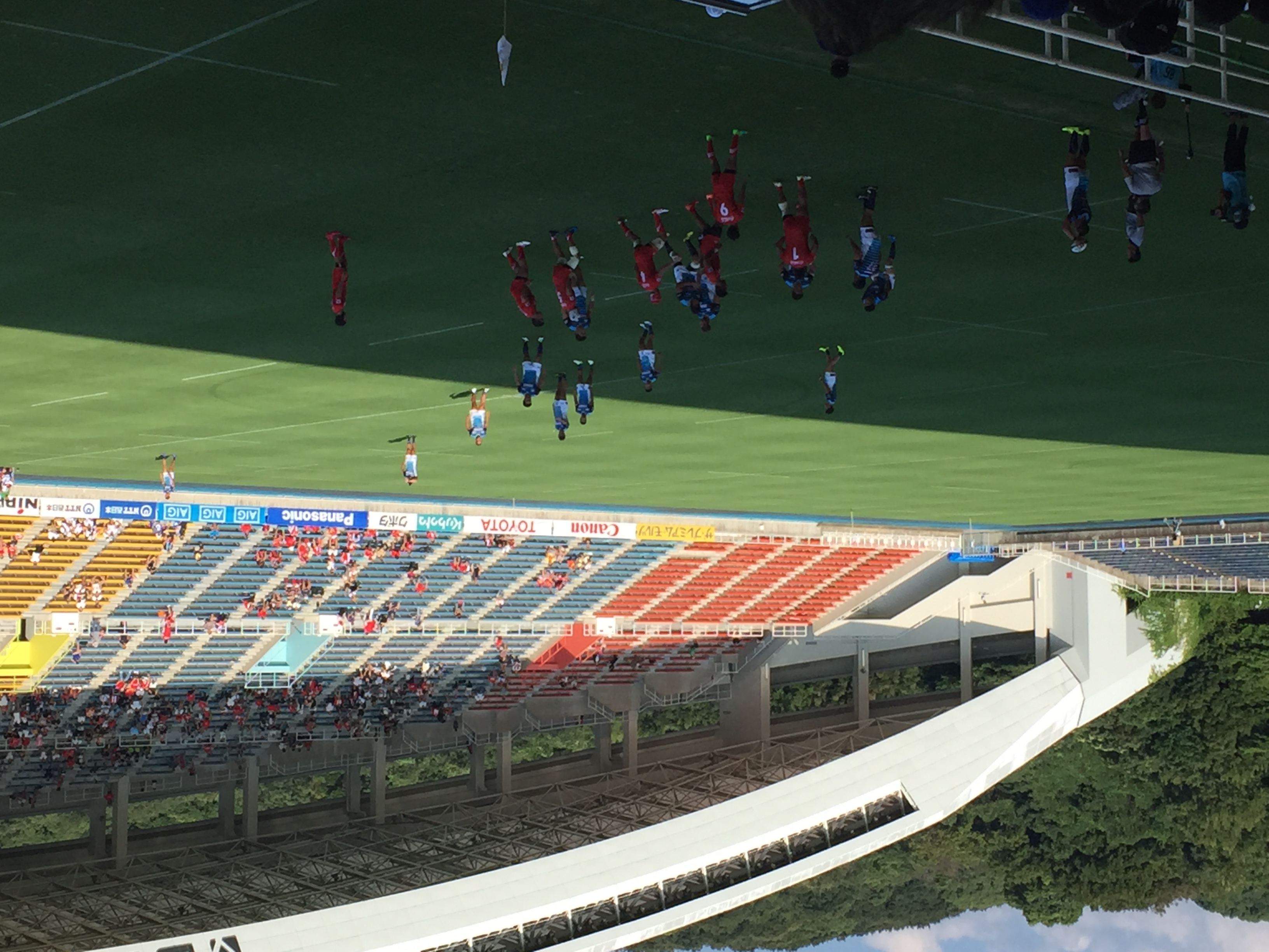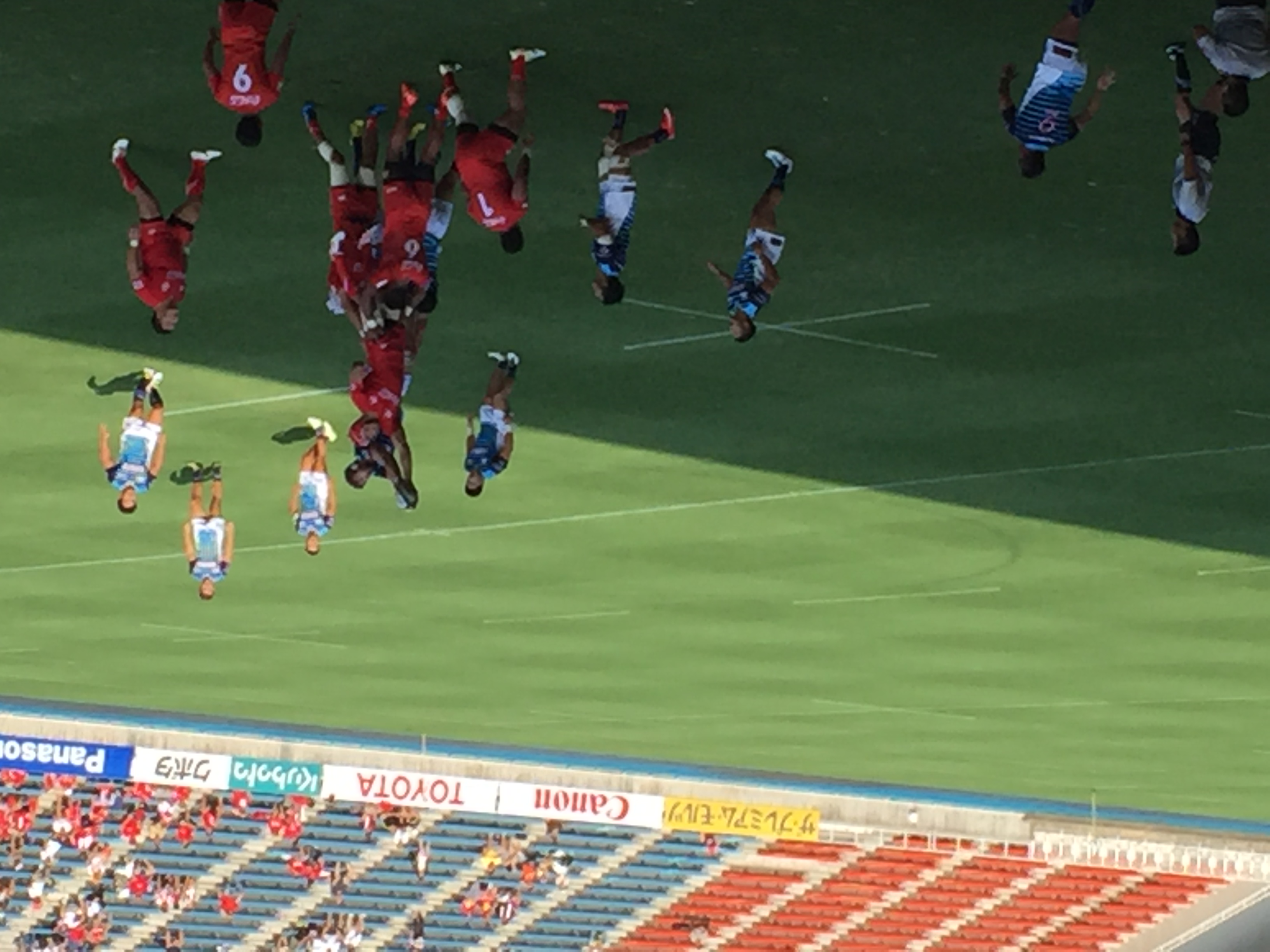 あれから半年が経過したレベルファイブスタジアムは、先週のオークランド代表戦とは違い、グラウンド大半に日差しが残り、観戦するスタンドのファンにまで熱中症への注意が喚起されるほど、蒸し暑いコンディションの中での試合となった。今回の試合は、地元チーム同士の「福岡ダービー」ということもあり、メインスタンドは”青”と”赤”のイメージカラーを身にまとったサポーターで、さらなる熱気を帯びていた。