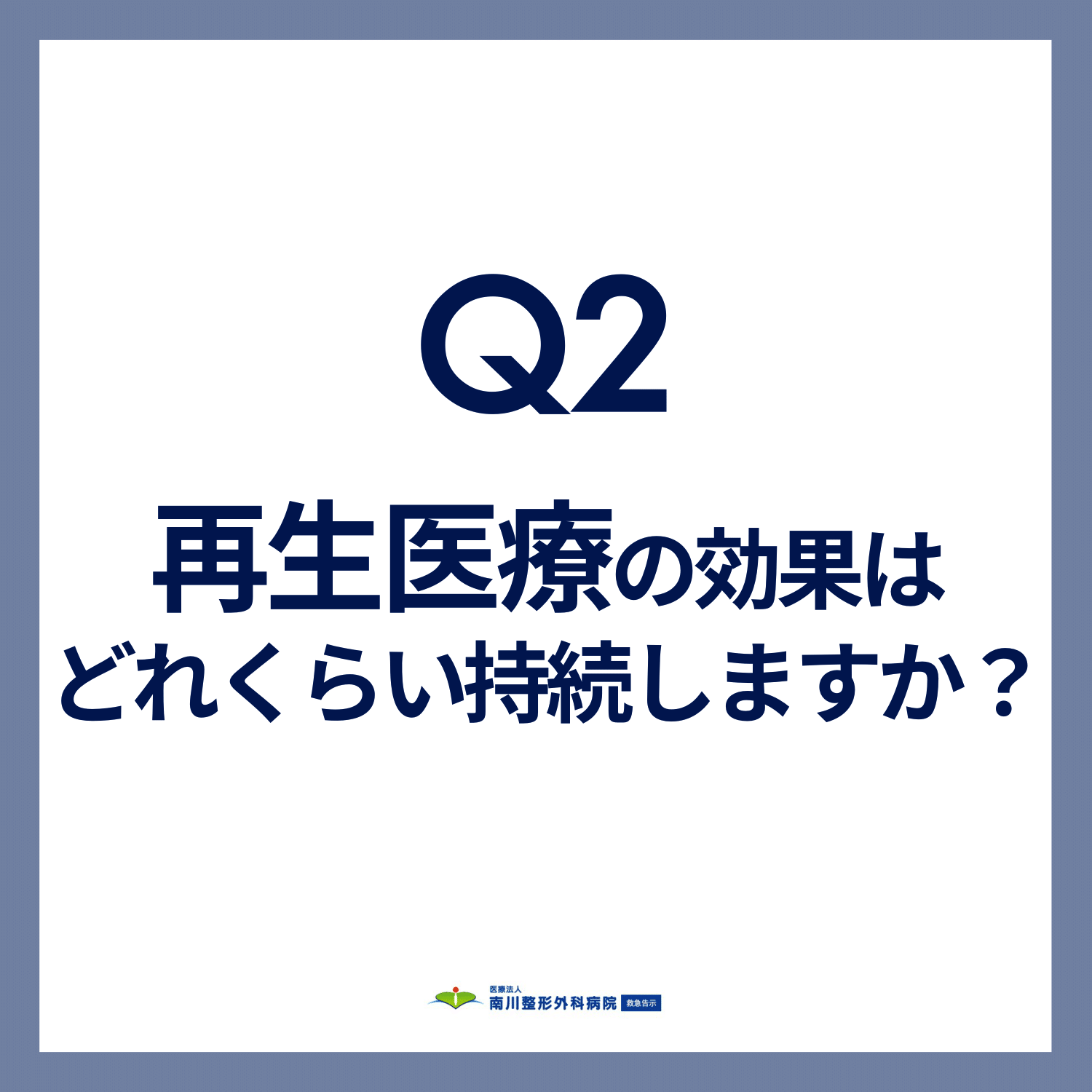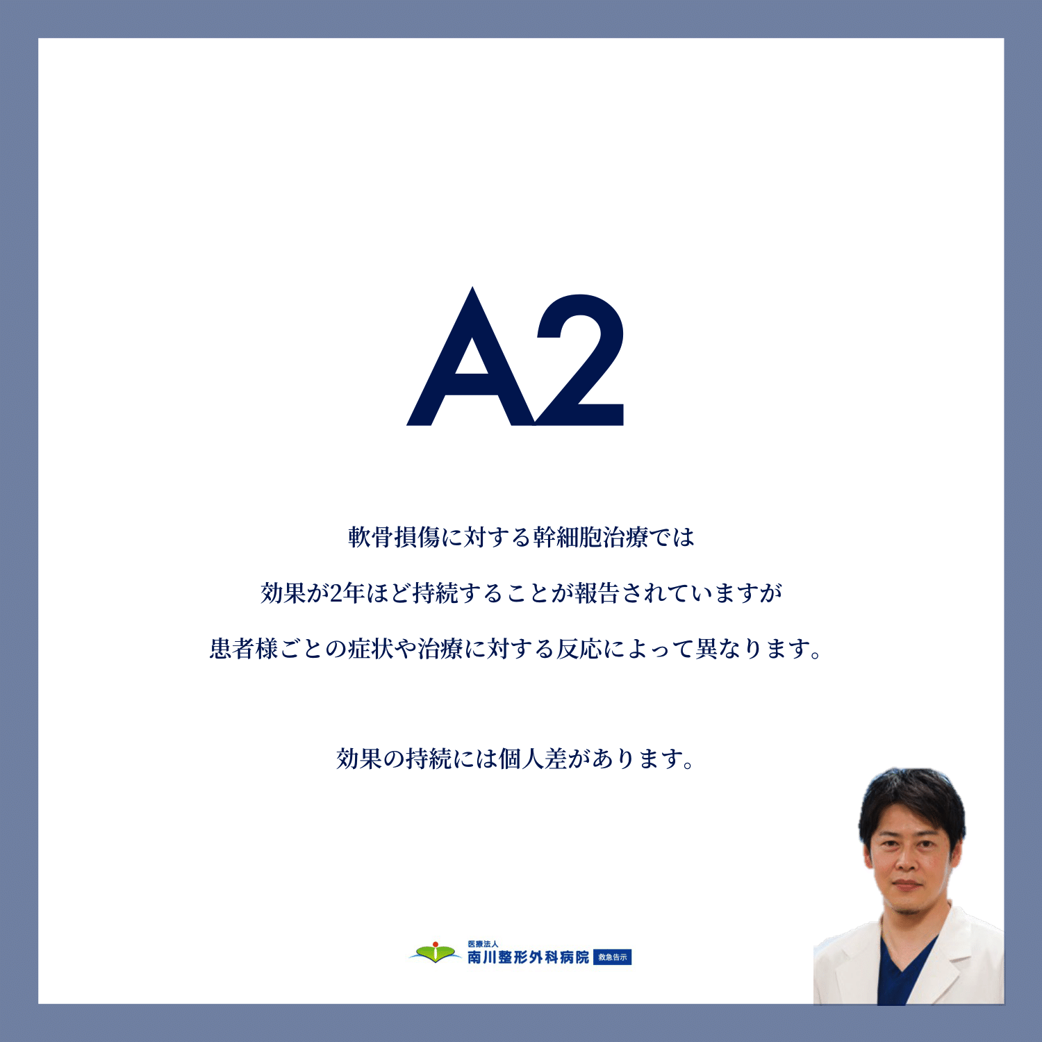 A2:「軟骨損傷に対する幹細胞治療では、効果が2年ほど持続することが報告されていますが、患者様ごとの症状や治療に対する反応によって異なります。効果の持続には個人差があります。」