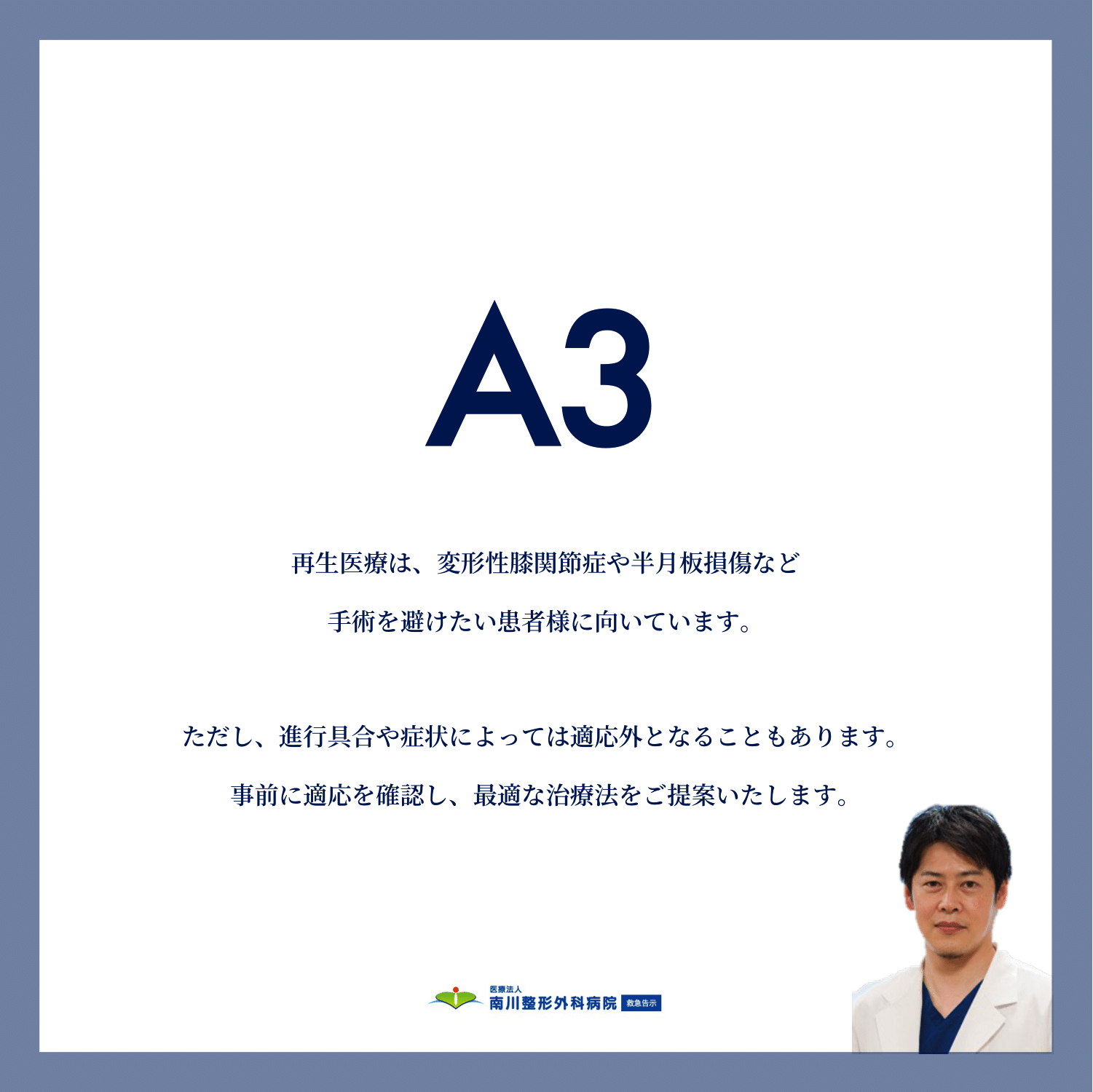 A3:「再生医療は、変形性膝関節症や半月板損傷など、手術を避けたい患者様に向いています。ただし、進行具合や症状によっては適応外となることもあります。事前に適応を確認し、最適な治療法をご提案いたします。」