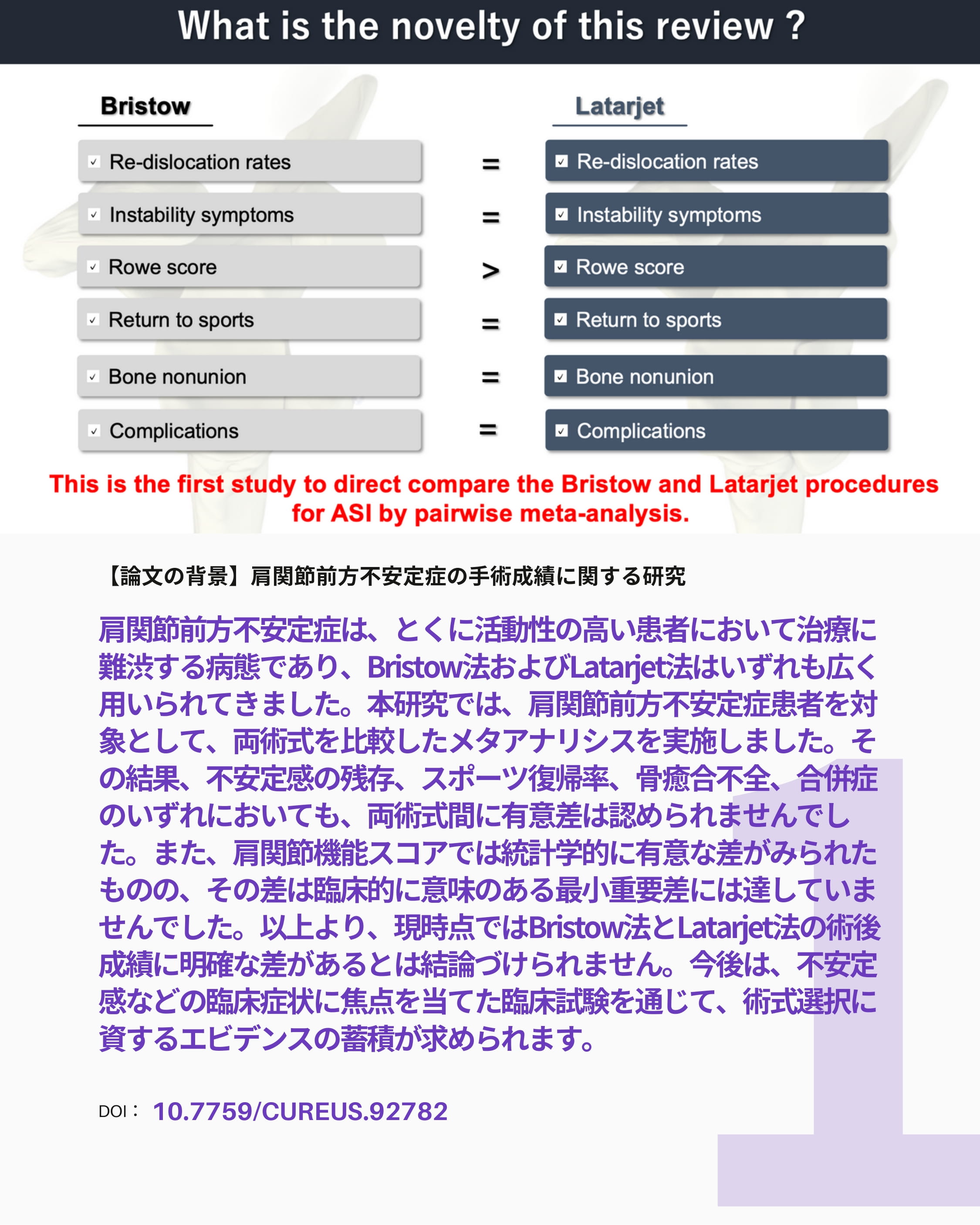 肩関節前方不安定症は、とくに活動性の高い患者において治療に難渋する病態であり、Bristow法およびLatarjet法はいずれも広く用いられてきました。本研究では、肩関節前方不安定症患者を対象として、両術式を比較したメタアナリシスを実施しました。その結果、不安定感の残存、スポーツ復帰率、骨癒合不全、合併症のいずれにおいても、両術式間に有意差は認められませんでした。また、肩関節機能スコアでは統計学的に有意な差がみられたものの、その差は臨床的に意味のある最小重要差には達していませんでした。以上より、現時点ではBristow法とLatarjet法の術後成績に明確な差があるとは結論づけられません。今後は、不安定感などの臨床症状に焦点を当てた臨床試験を通じて、術式選択に資するエビデンスの蓄積が求められます。