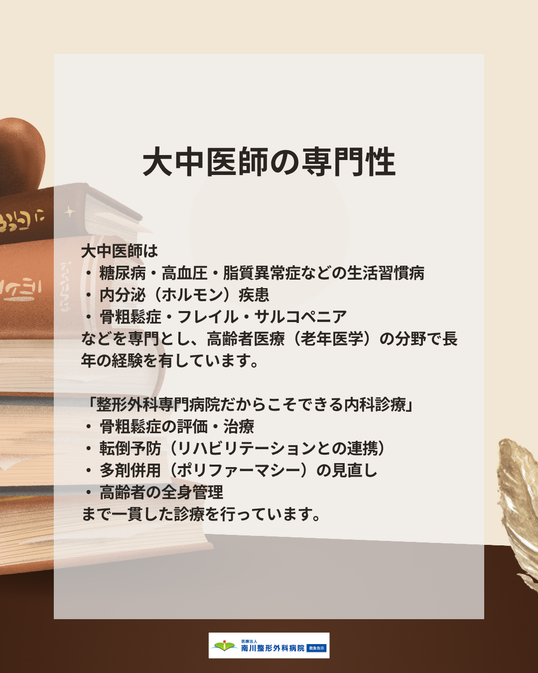 今回、大中医師は「骨代謝・骨粗鬆症」分野を担当し、高齢者における骨の変化や骨粗鬆症の病態、治療の考え方について解説しています。 骨は単なる“体を支える組織”ではなく、カルシウムやリンのバランスを保つ重要な役割を担っています。