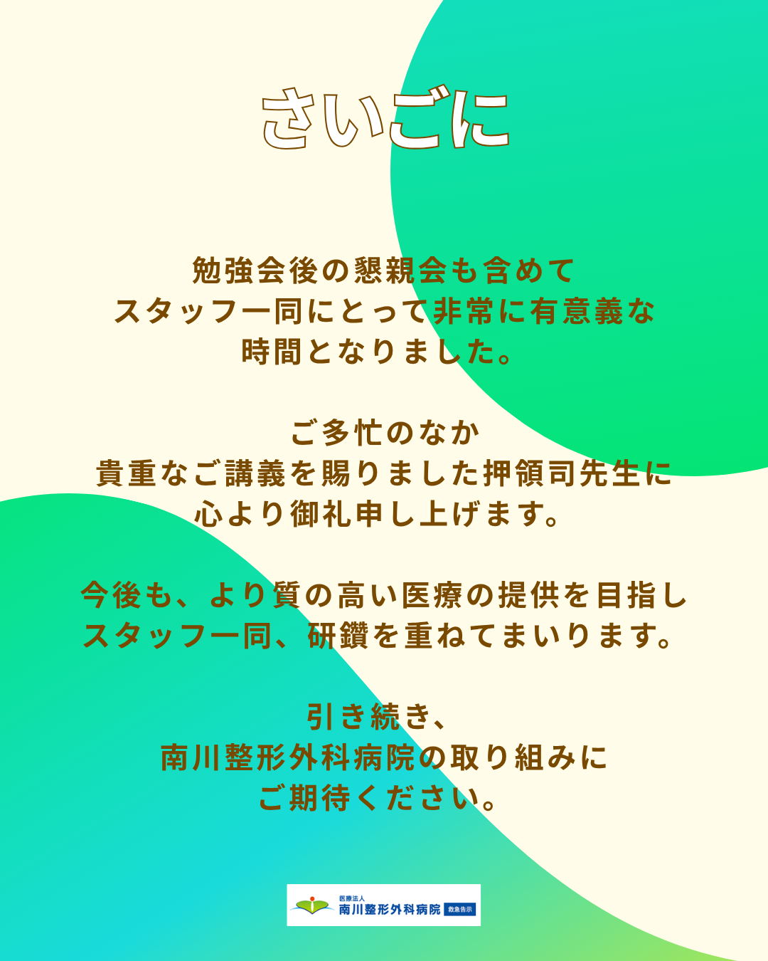 ご多忙のなか、貴重なご講義を賜りました押領司先生に、心より御礼申し上げます。今後も、より質の高い医療の提供を目指し、スタッフ一同、研鑽を重ねてまいります。引き続き、南川整形外科病院の取り組みにご期待ください。