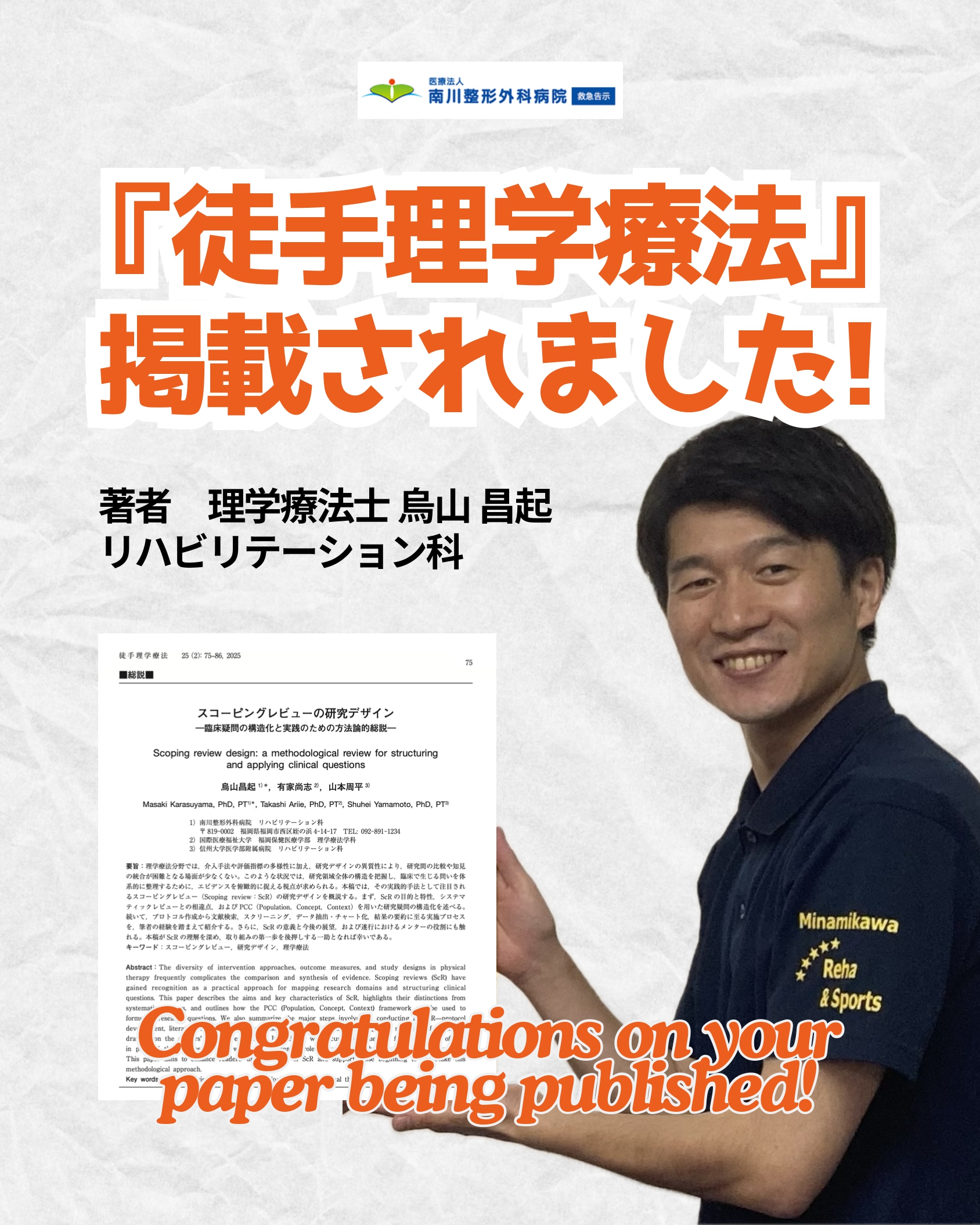【論文掲載】リハビリテーション科の理学療法士 烏山昌起の総説論文が『徒手理学療法』に掲載されました。