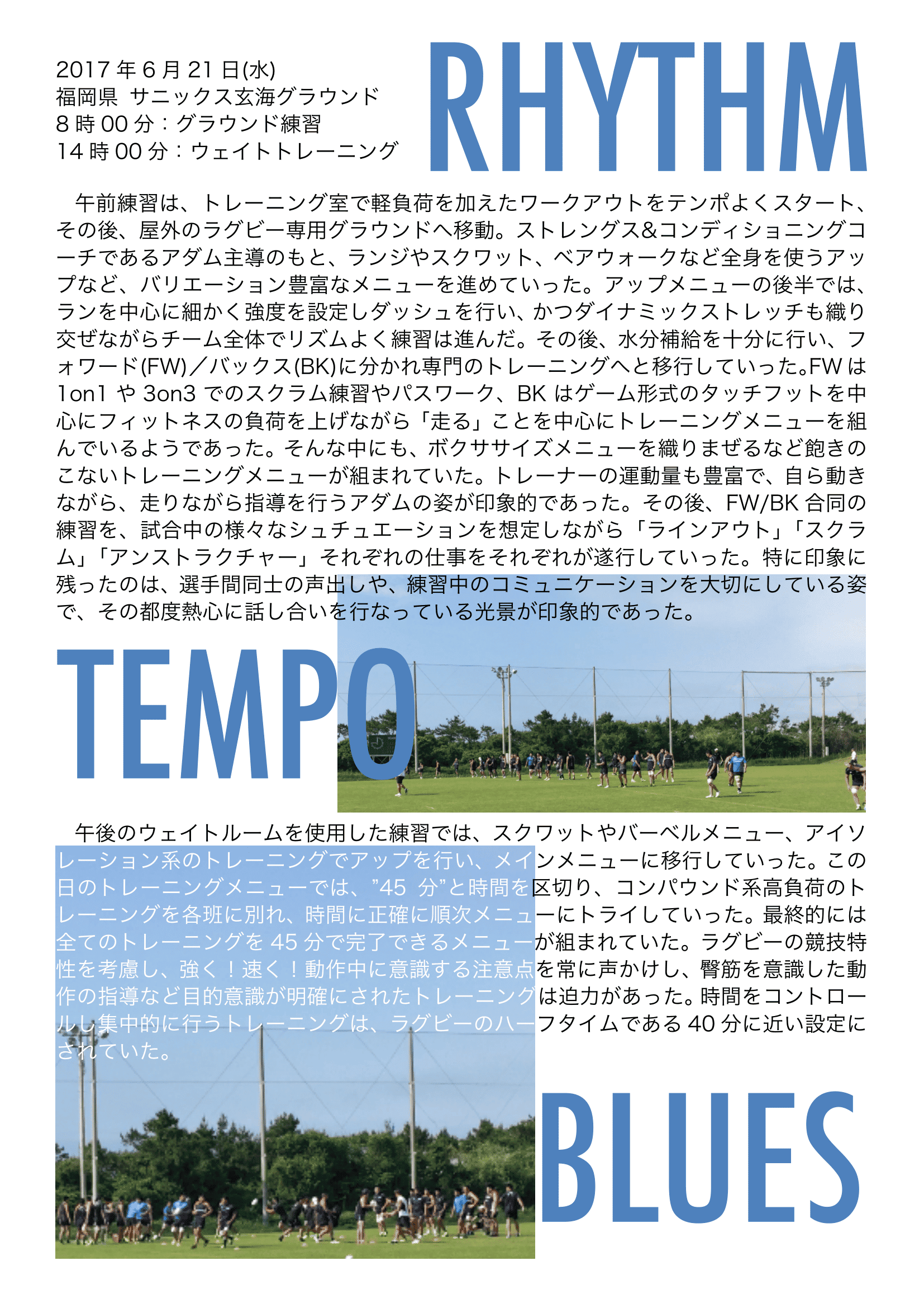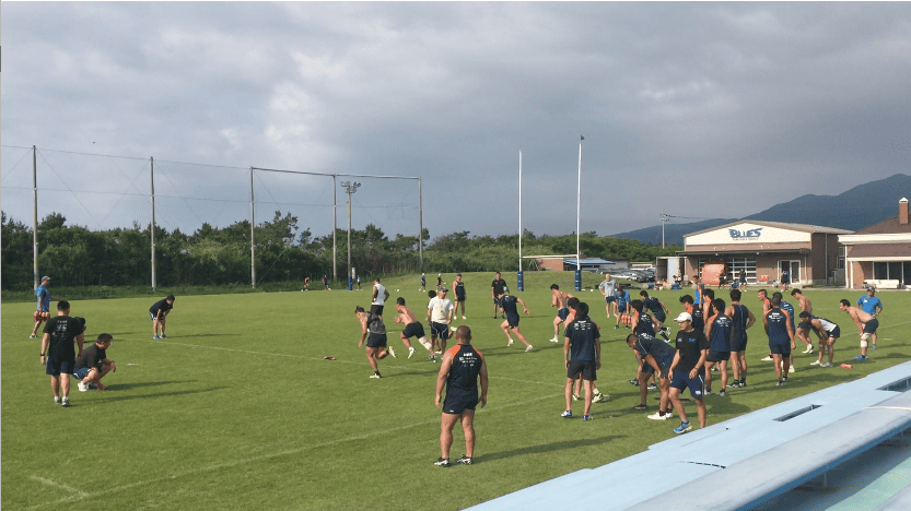 午前練習は、トレーニング室で軽負荷を加えたワークアウトをテンポよくスタート、その後、屋外のラグビー専用グラウンドへ移動。ストレングス&コンディショニングコーチであるアダム主導のもと、ランジやスクワット、ベアウォークなど全身を使うアップなど、バリエーション豊富なメニューを進めていった。アップメニューの後半では、ランを中心に細かく強度を設定しダッシュを行い、かつダイナミックストレッチも織り交ぜながらチーム全体でリズムよく練習は進んだ。その後、水分補給を十分に行い、フォワード(FW)/バックス(BK)に分かれ専門のトレーニングへと移行していった。FWは1on1や3on3でのスクラム練習やパスワーク、BKはゲーム形式のタッチフットを中心にフィットネスの負荷を上げながら「走る」ことを中心にトレーニングメニューを組んでいるようであった。そんな中にも、ボクササイズメニューを織りまぜるなど飽きのこないトレーニングメニューが組まれていた。トレーナーの運動量も豊富で、自ら動きながら、走りながら指導を行うアダムの姿が印象的であった。その後、FW/BK合同の練習を、試合中の様々なシュチュエーションを想定しながら「ラインアウト」「スクラム」「アンストラクチャー」それぞれの仕事をそれぞれが遂行していった。特に印象に残ったのは、選手間同士の声出しや、練習中のコミュニケーションを大切にしている姿で、その都度熱心に話し合いを行なっている光景が印象的であった。