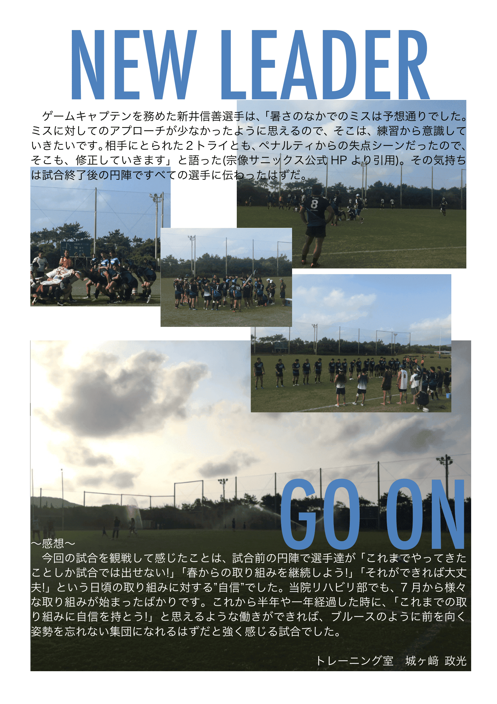 ゲームキャプテンを務めた新井信善選手は、「暑さのなかでのミスは予想通りでした。ミスに対してのアプローチが少なかったように思えるので、そこは、練習から意識していきたいです。相手にとられた2トライとも、ペナルティからの失点シーンだったので、そこも、修正していきます」と語った(宗像サニックス公式HPより引用)。その気持ちは試合終了後の円陣ですべての選手に伝わったはずだ。