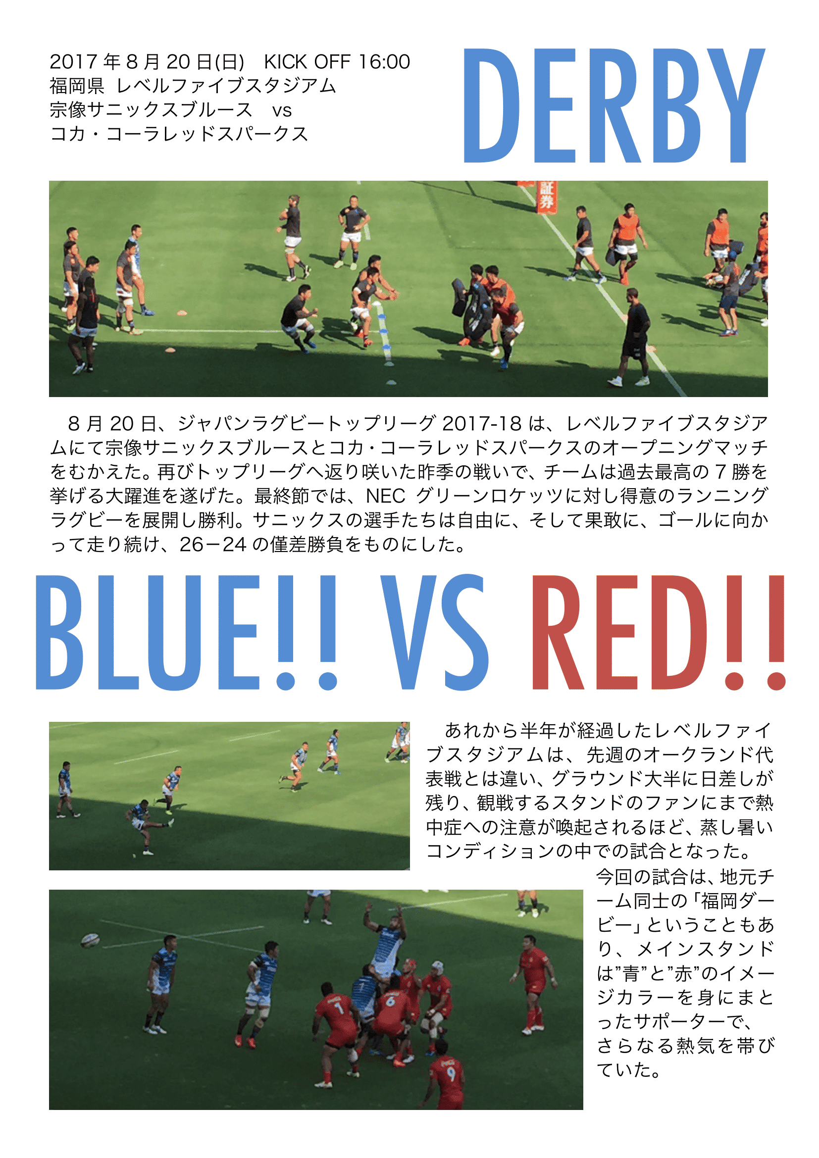 8月20日、ジャパンラグビートップリーグ2017-18は、レベルファイブスタジアムにて宗像サニックスブルースとコカ・コーラレッドスパークスのオープニングマッチをむかえた。再びトップリーグへ返り咲いた昨季の戦いで、チームは過去最高の7勝を挙げる大躍進を遂げた。最終節では、NECグリーンロケッツに対し得意のランニングラグビーを展開し勝利。サニックスの選手たちは自由に、そして果敢に、ゴールに向かって走り続け、26-24の僅差勝負をものにした。