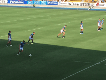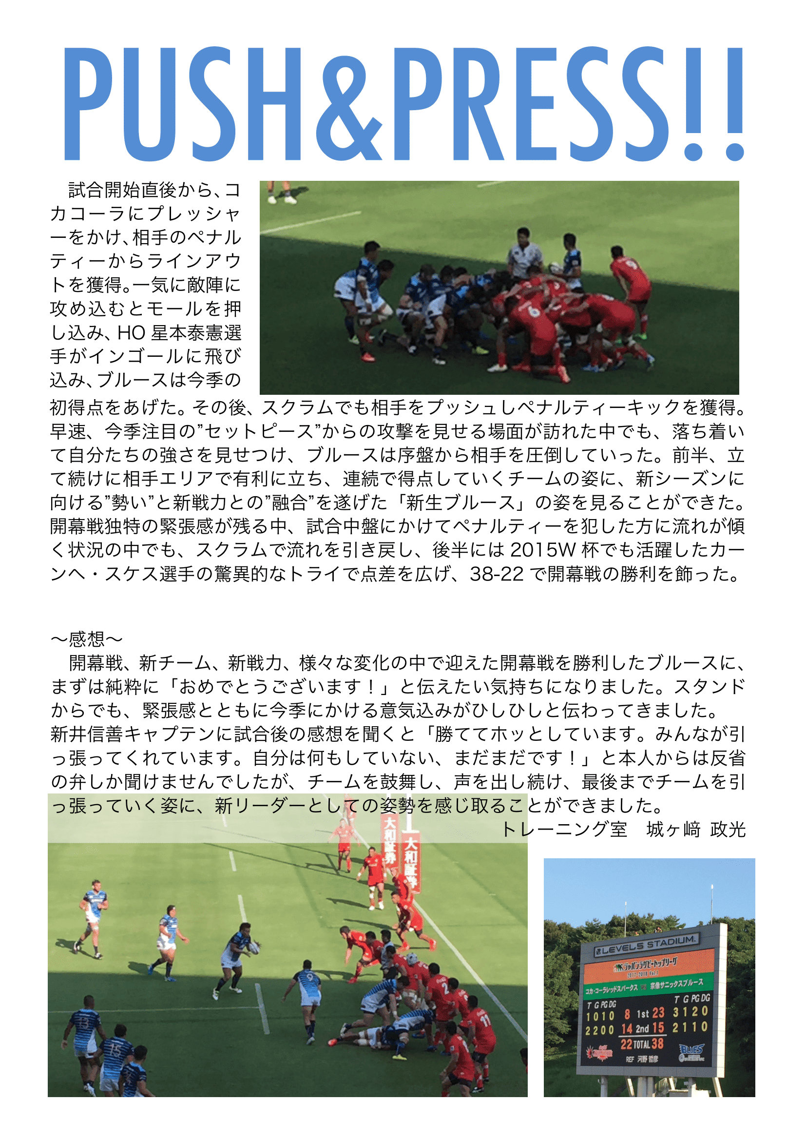 試合開始直後から、コカコーラにプレッシャーをかけ、相手のペナルティーからラインアウトを獲得。一気に敵陣に攻め込むとモールを押し込み、HO星本泰憲選手がインゴールに飛び込み、ブルースは今季の初得点をあげた。その後、スクラムでも相手をプッシュしペナルティーキックを獲得。早速、今季注目の”セットピース”からの攻撃を見せる場面が訪れた中でも、落ち着いて自分たちの強さを見せつけ、ブルースは序盤から相手を圧倒していった。前半、立て続けに相手エリアで有利に立ち、連続で得点していくチームの姿に、新シーズンに向ける”勢い”と新戦力との”融合”を遂げた「新生ブルース」の姿を見ることができた。開幕戦独特の緊張感が残る中、試合中盤にかけてペナルティーを犯した方に流れが傾く状況の中でも、スクラムで流れを引き戻し、後半には2015W杯でも活躍したカーンヘ・スケス選手の驚異的なトライで点差を広げ、38-22で開幕戦の勝利を飾った。