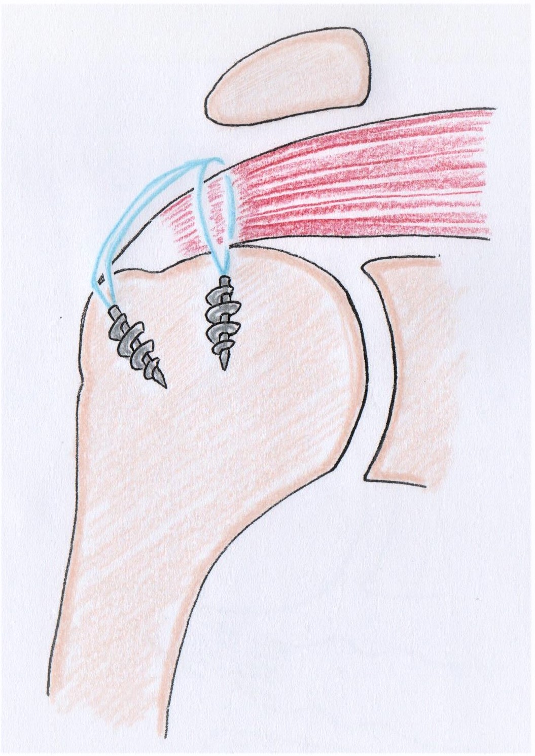 上腕骨にアンカーを挿入し、腱板の断端に糸をかけて固定します。