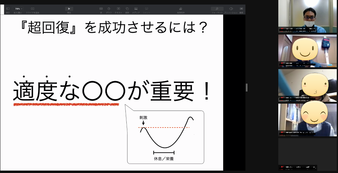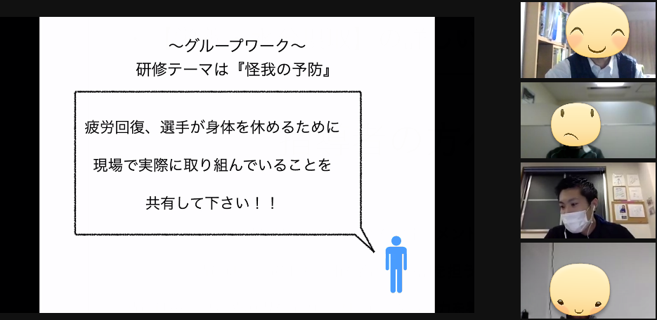 令和3年2月2日(火)オンライン開催にて、ケガをしにくいカラダについて・ケガを予防するポイント、コンディショニングを管理するためのオススメの方法など、約2時間に渡ってクリニックを開催しました。オンライン開催のため直接参加者の方々とお会いできませんでしたが、グループワークを取り入れることで参加者一人一人と意見交換をすることができて、私達にとっても貴重な時間を共有する機会となりました。