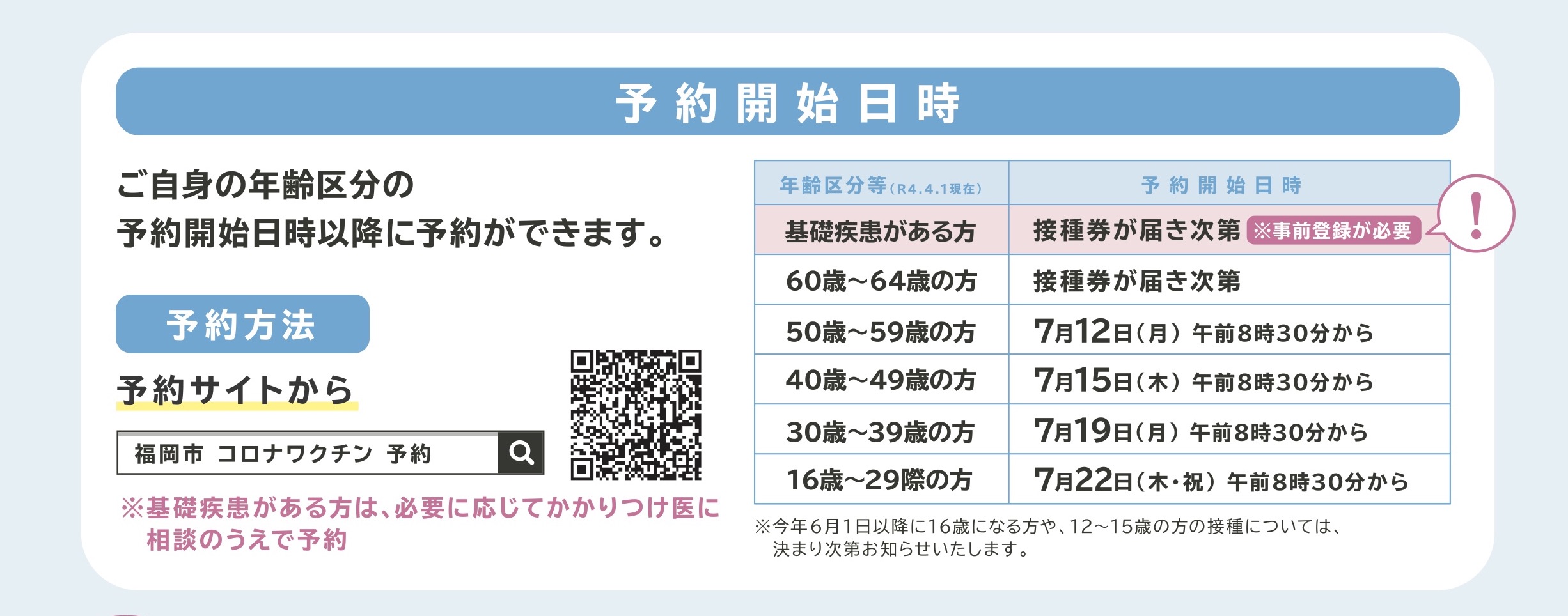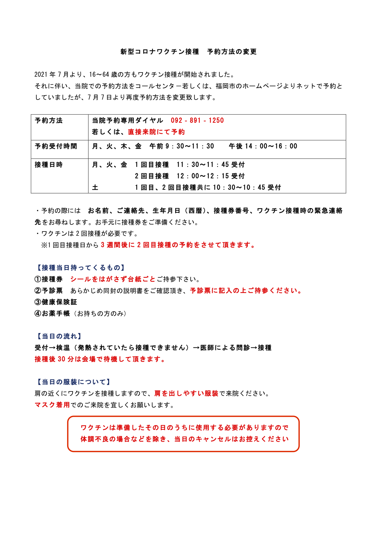 それに伴い、当院での予約方法をコールセンター若しくは、福岡市のホームページよりネットで予約としていましたが、7月7日より再度予約方法を変更致します。