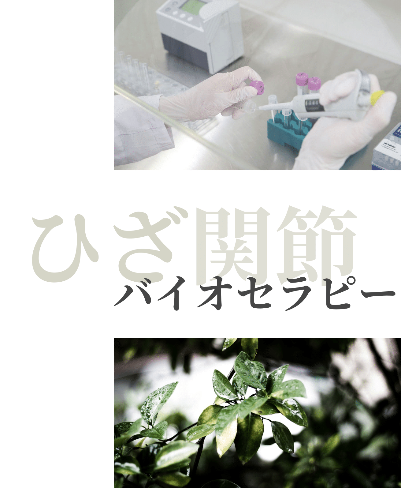 「 ひざ関節バイオセラピー 」ひざのバイオセラピーは、症状が軽度の時の対症療法である「薬物療法・注射療法」の時期から、「手術的治療」でしかケアできない末期に至るまで行える、ひざ関節治療の新たな選択肢です。