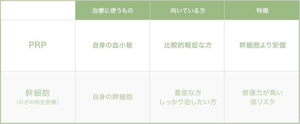 現在、ひざのバイオセラピーと呼ばれるものには、“PRP”での治療法と“幹細胞”での治療法があります。