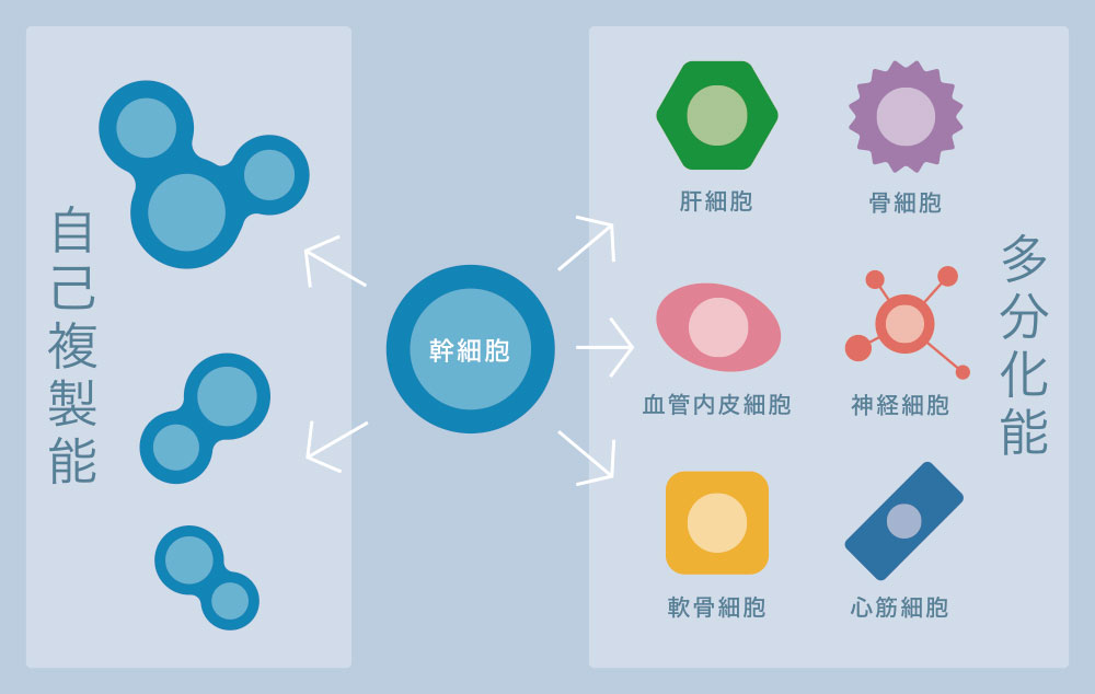 幹細胞とは、細胞分裂の際に自身を複製する「自己複製能」と、自身とは異なる様々な細胞に変化する能力である「多分化能」を併せ持つ細胞のことです。