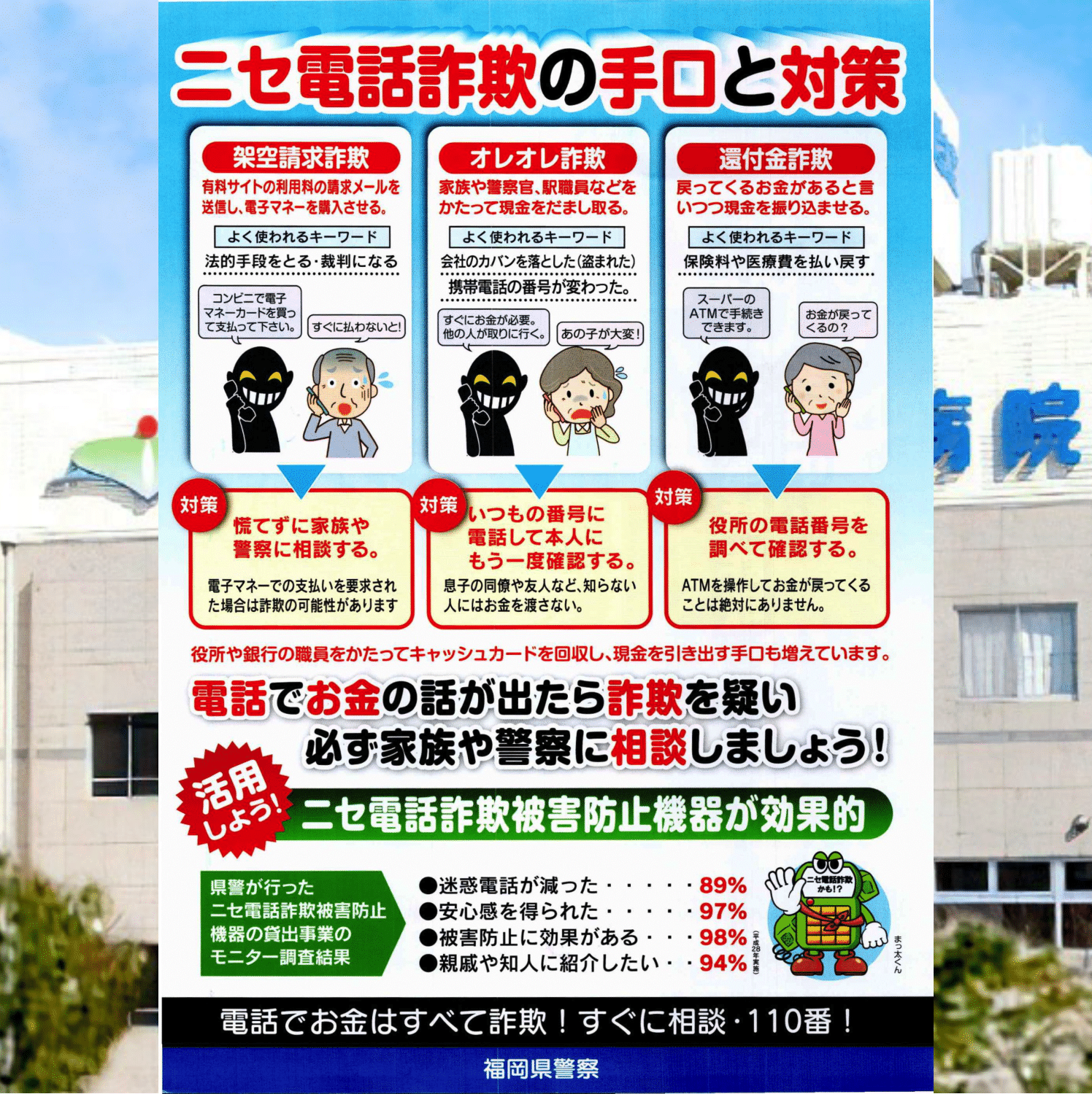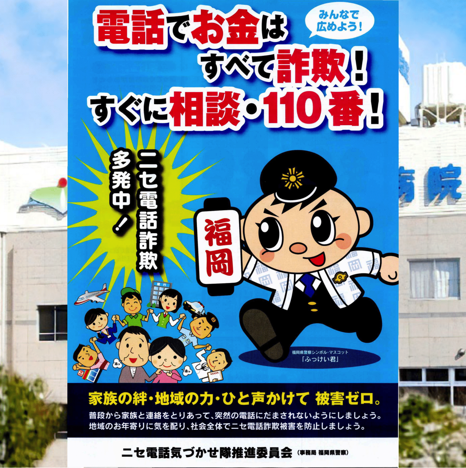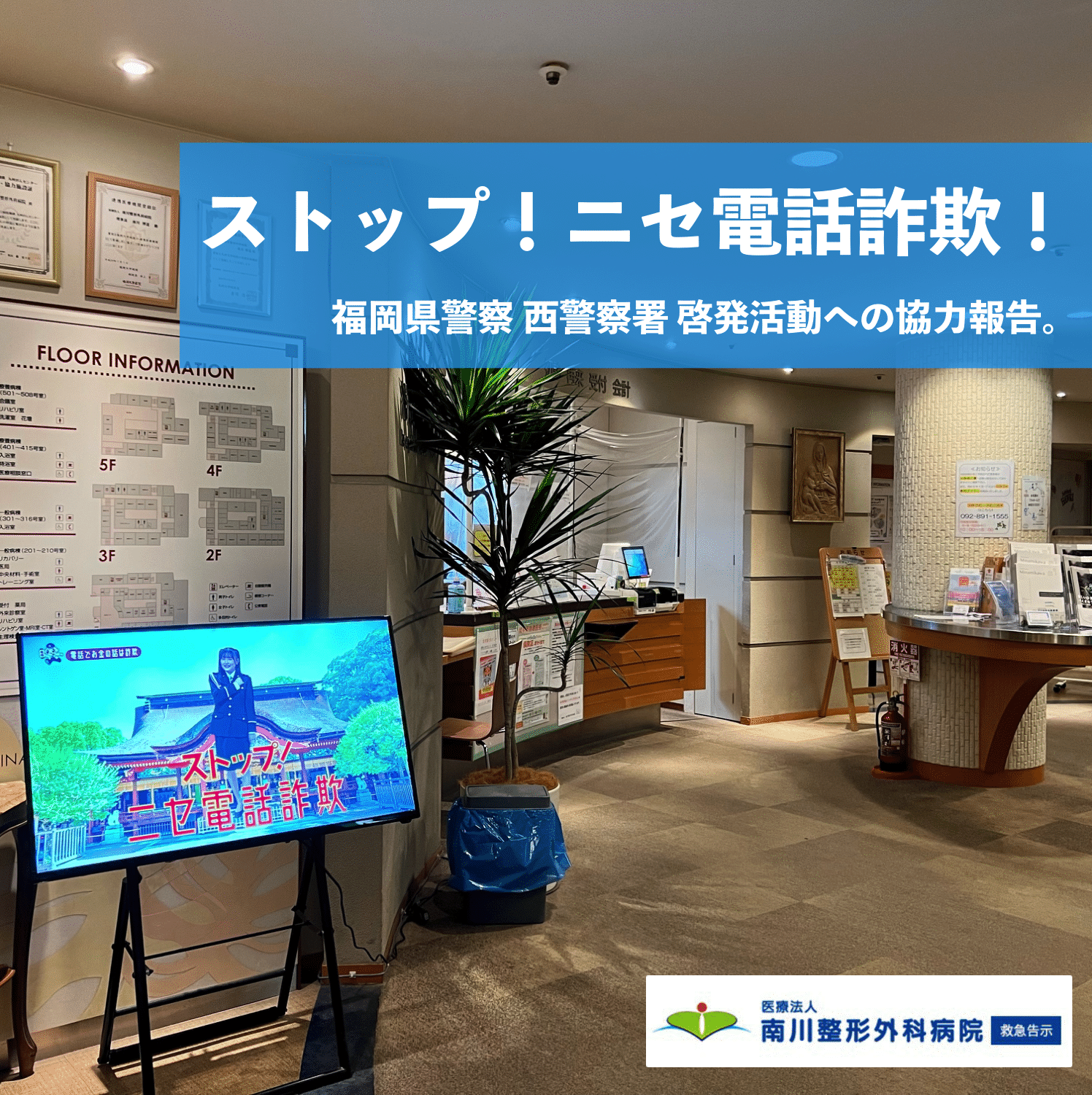 現在、福岡県の西警察署管内において「ニセ電話詐欺」の被害が相次いで発生しております。西警察署では「西風WEST!STOP!!ニセ電話詐欺0(ゼロ)作戦」と銘打ち、広報啓発活動・注意喚起・ATMでの警戒活動等を実施しています。被害の特徴として、「息子さんが事故にあった」と病院を騙る嘘の連絡や、区役所を語り「医療費」の払い戻し名目にATMに誘導する還付金詐欺など、医療を偽った詐欺被害が発生している模様です。そのため、西警察署と協力し地域の皆さんを守るため、院内での啓発活動・注意喚起をスタートいたします。1階ロビーのモニターにて「ニセ電話詐欺防止広報用動画」を放映しております。お立ち寄りの際はぜひご覧ください。