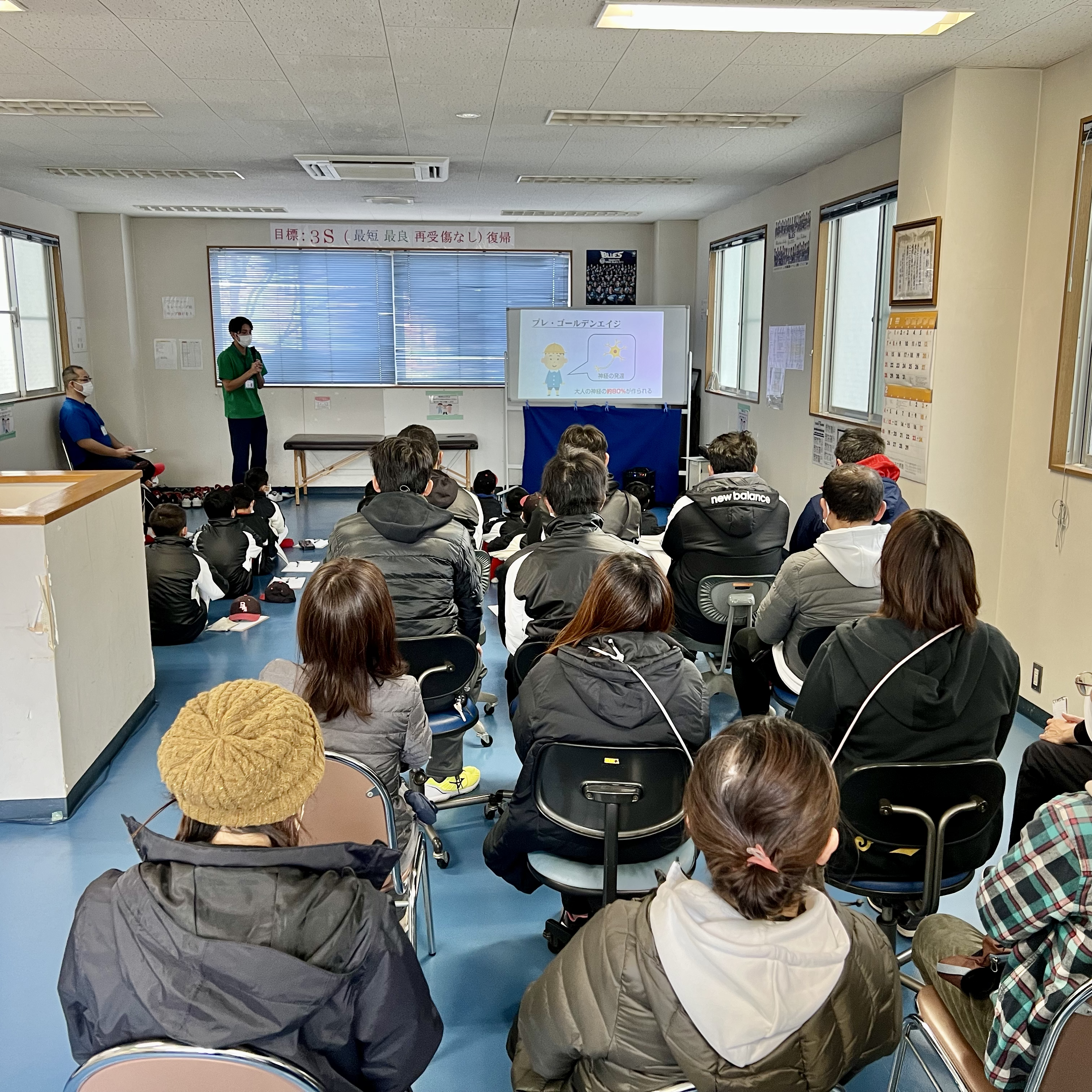 小学生の生徒さんも真剣にメモを取りながら、保護者の方も活発に反応してくださり、柔軟性チェックやストレッチングの実践も盛り上がりました!全体を通して楽しく行うことができ、今後も地域の方々とのコミュニケーションを図り、交流を深めたいと考えております!