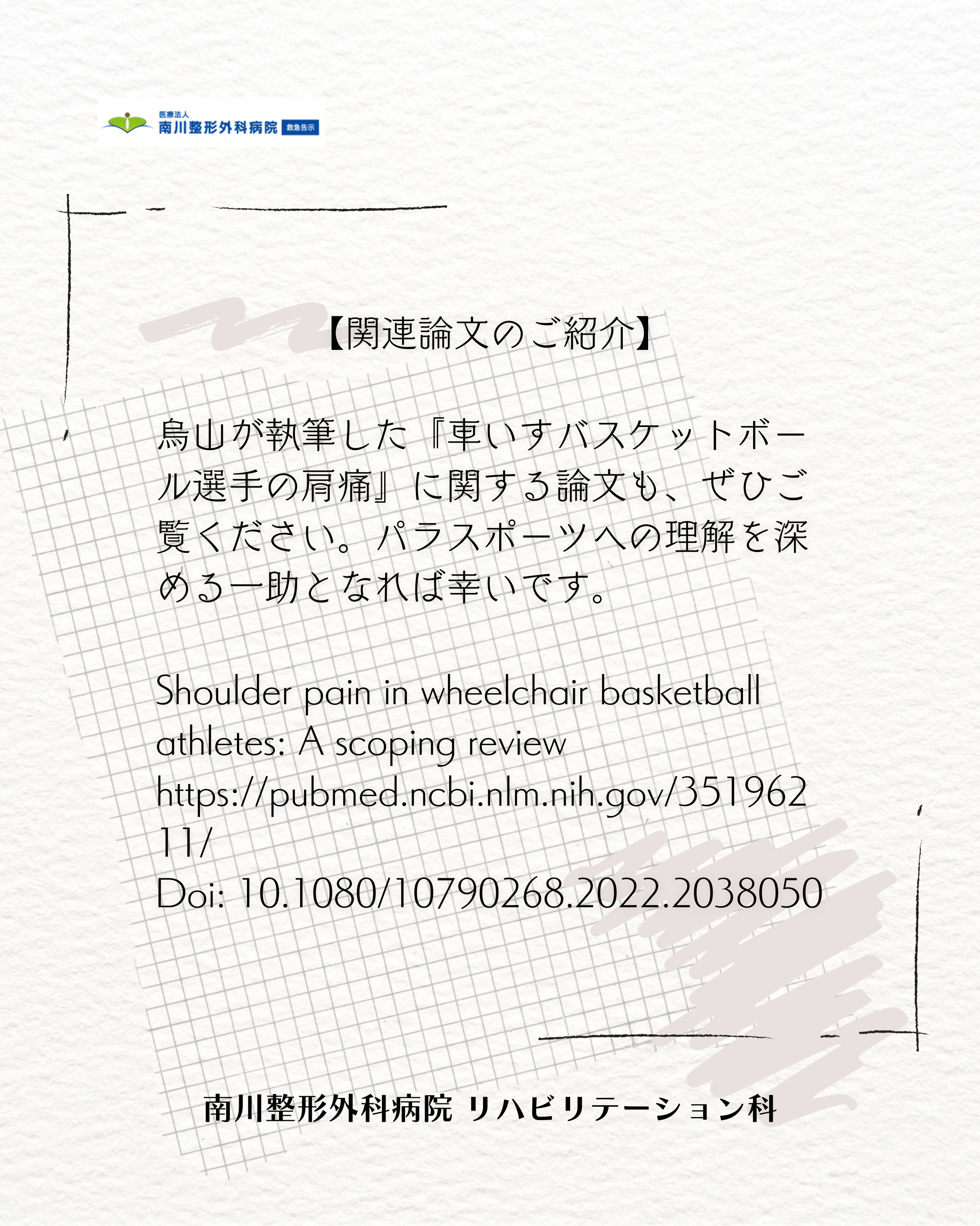 烏山が執筆した『車いすバスケットボール選手の肩痛』に関する論文も、ぜひご覧ください。パラスポーツへの
