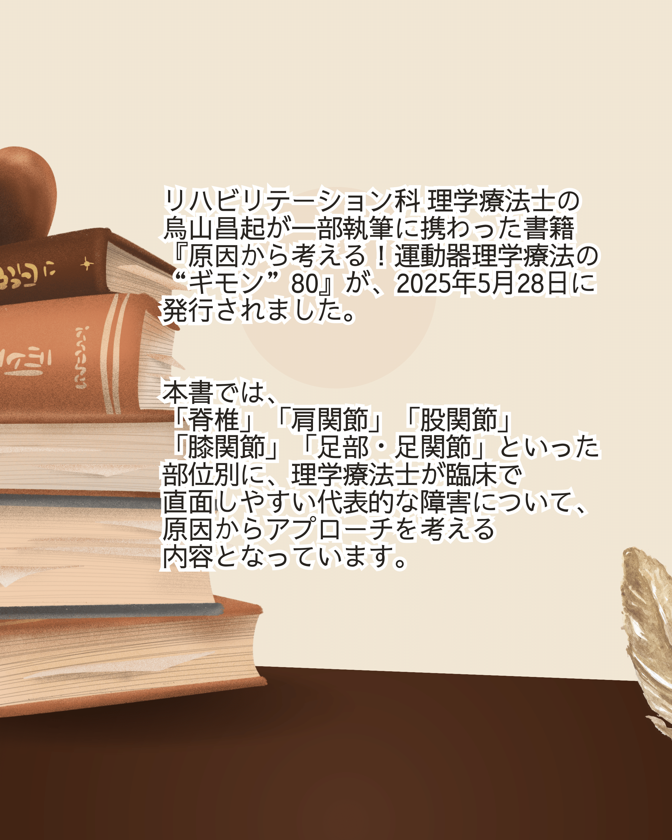 リハビリテーション科 理学療法士の烏山昌起が一部執筆に携わった書籍『原因から考える!運動器理学療法の“ギモン”80』が、2025年5月28日に発行されました。本書では、「脊椎」「肩関節」「股関節」「膝関節」「足部・足関節」といった部位別に、理学療法士が臨床で直面しやすい代表的な障害について、原因からアプローチを考える内容となっています。