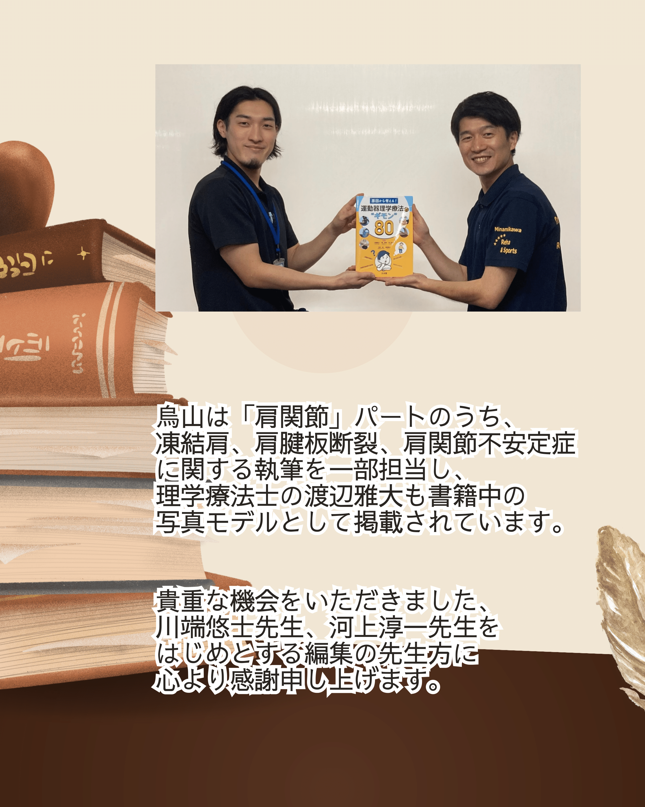 烏山は「肩関節」パートのうち、凍結肩、肩腱板断裂、肩関節不安定症に関する執筆を一部担当し、理学療法士の渡辺雅大も書籍中の写真モデルとして掲載されています。このような貴重な機会をいただきました、川端悠士先生、河上淳一先生をはじめとする編集の先生方に心より感謝申し上げます。