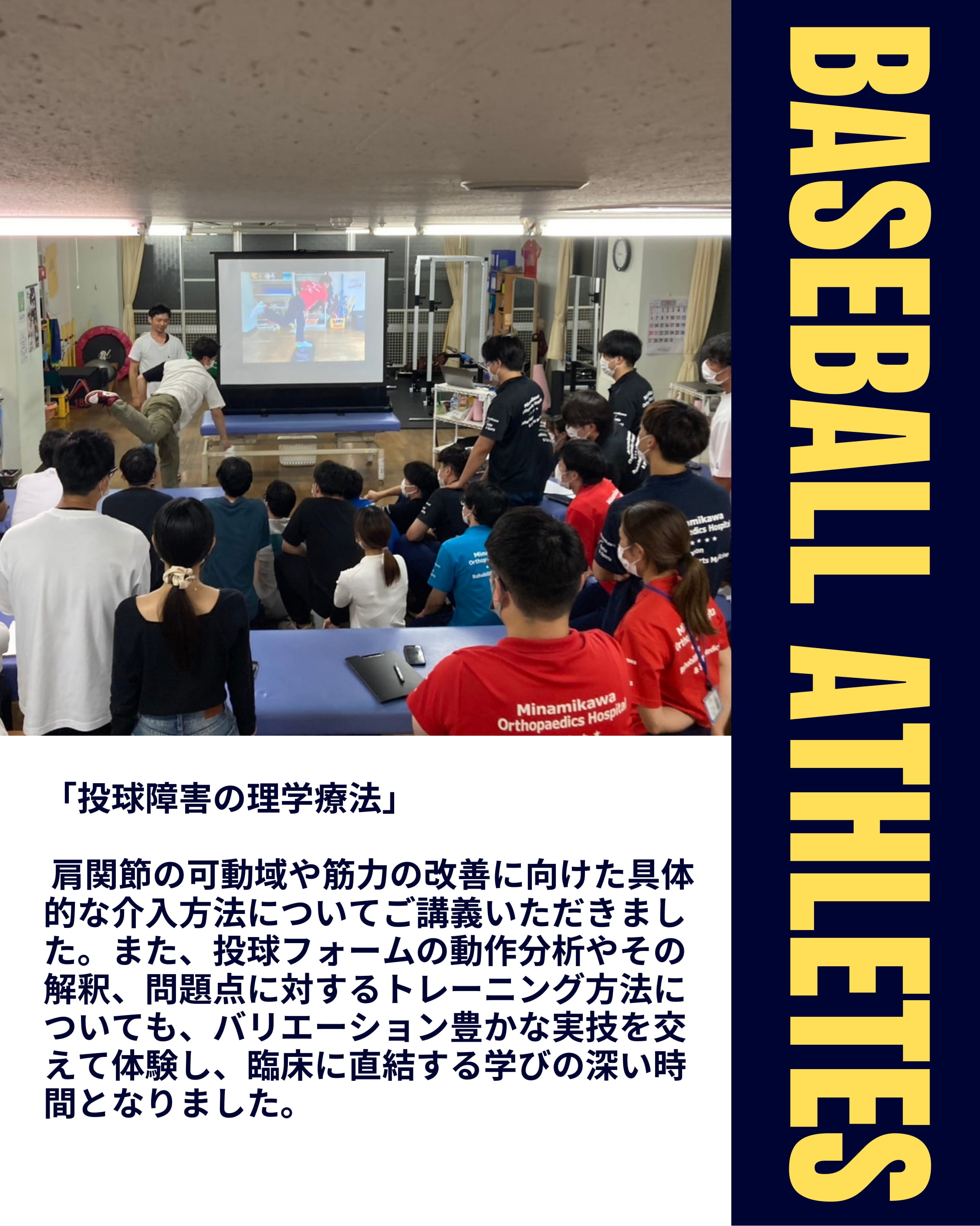 『投球障害の理学療法〜治療編〜』について今回は、第1弾「評価編」で学んだ内容をもとに、肩関節の可動域や筋力の改善に向けた具体的な介入方法についてご講義いただきました。また、投球フォームの動作分析やその解釈、問題点に対するトレーニング方法についても、バリエーション豊かな実技を交えて体験し、臨床に直結する学びの深い時間となりました。
