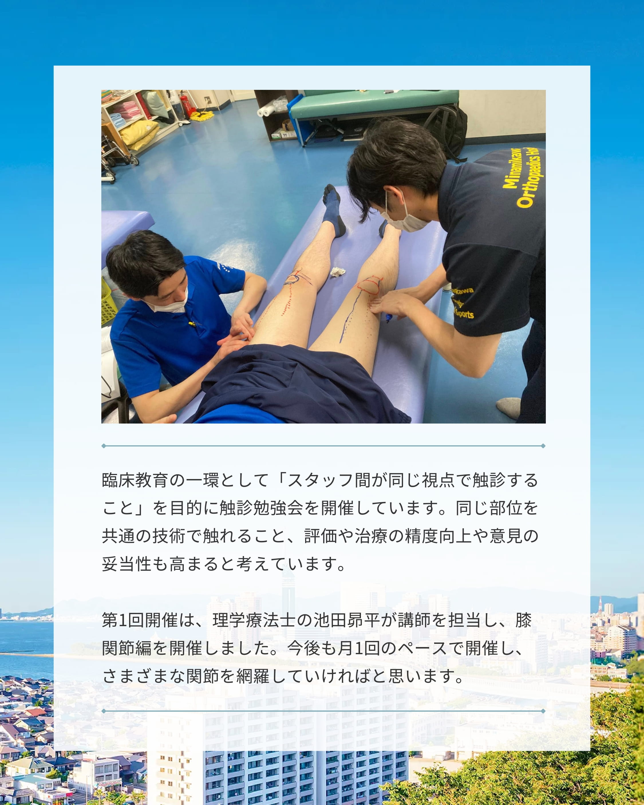 同じ部位を共通の技術で触れること、評価や治療の精度向上や意見の妥当性も高まると考えています。第1回開催は、理学療法士の池田昴平が講師を担当し、膝関節編を開催しました。今後も月1回のペースで開催し、さまざまな関節を網羅していければと思います。
