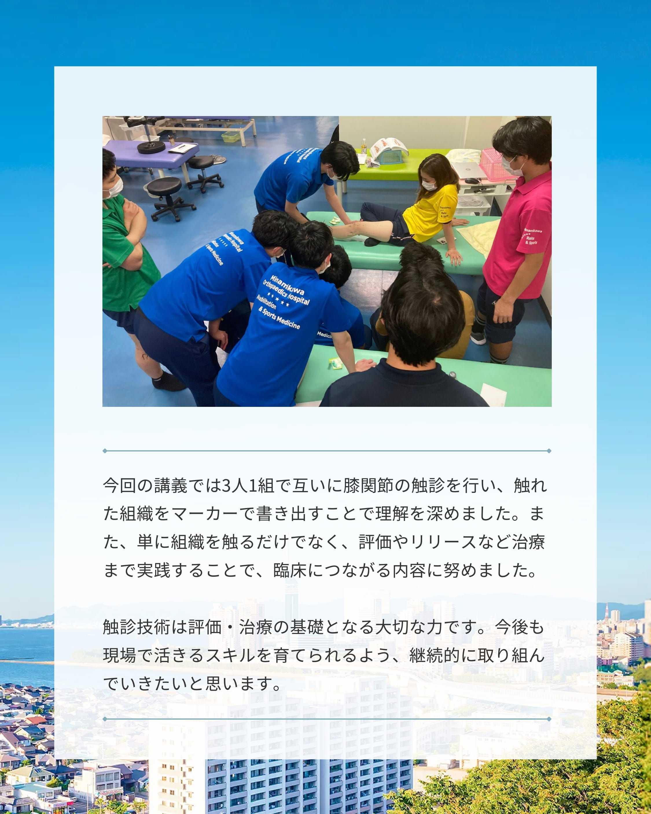 触診技術は評価・治療の基礎となる大切な力です。今後も現場で活きるスキルを育てられるよう、継続的に取り組んでいきたいと思います。