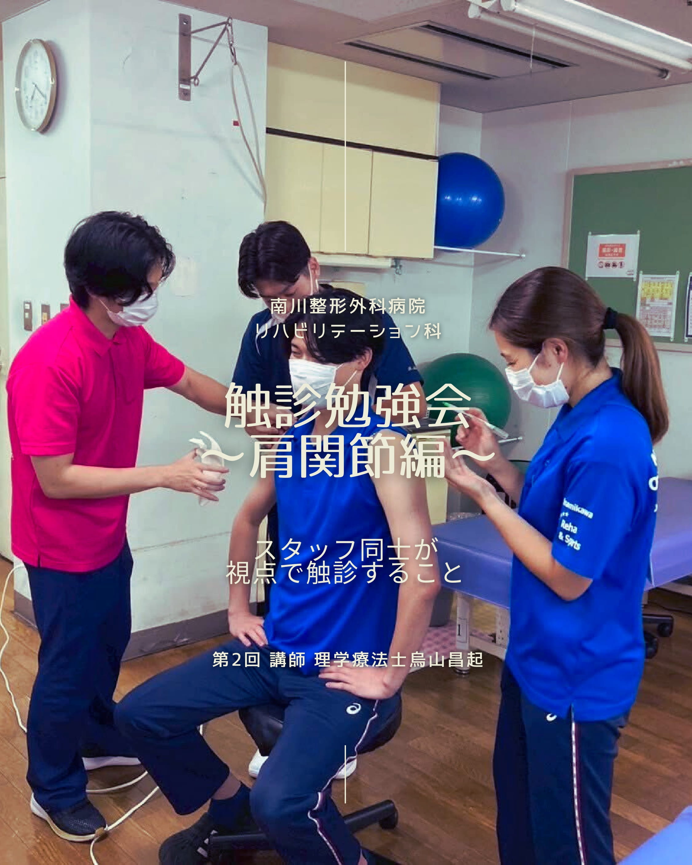 今年度は、臨床教育の一環として「スタッフ間が同じ視点で触診すること」を目的に触診勉強会を開催しています。同じ部位を共通の技術で触れること、評価や治療の精度向上や意見の妥当性も高まると考えています。第2回開催は、理学療法士の烏山昌起が講師を担当し、肩関節編を開催しました。