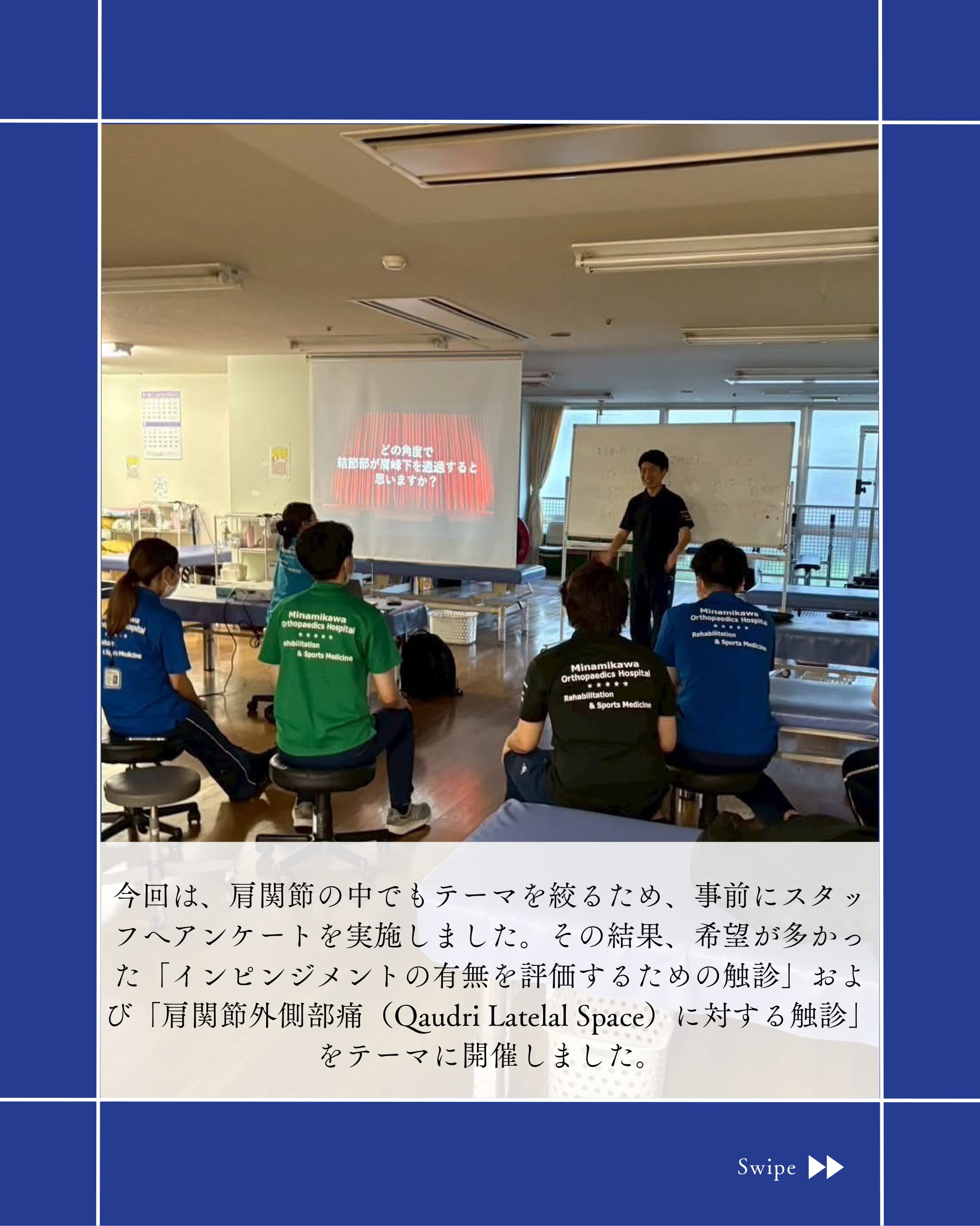 今回は、肩関節の中でもテーマを絞るため、事前にスタッフへアンケートを実施しました。その結果、希望が多かった「インピンジメントの有無を評価するための触診」および「肩関節外側部痛(Qaudri Latelal Space)に対する触診」をテーマに開催しました。