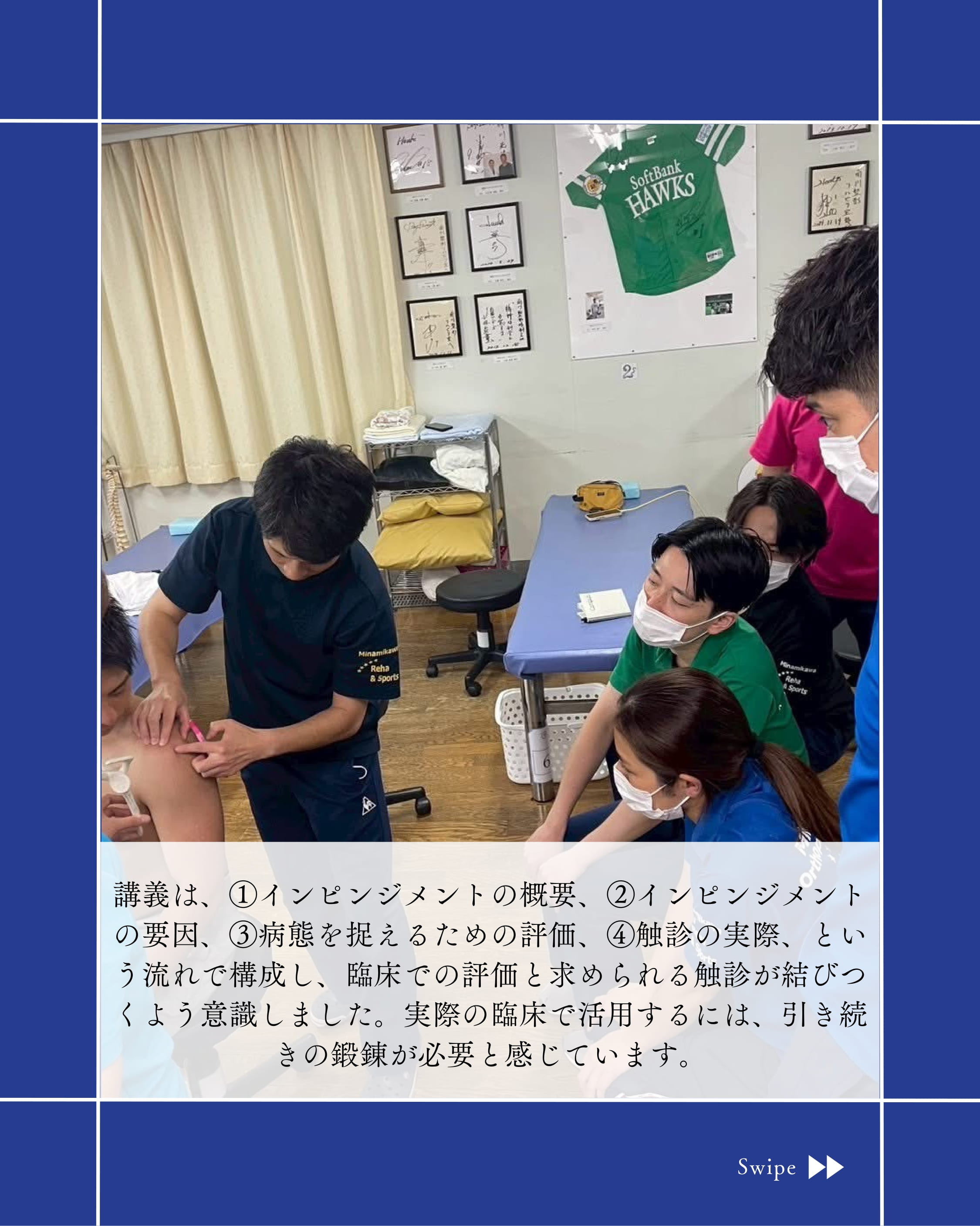 講義は、①インピンジメントの概要、②インピンジメントの要因、③病態を捉えるための評価、④触診の実際、という流れで構成し、臨床での評価と求められる触診が結びつくよう意識しました。実際の臨床で活用するには、引き続きの鍛錬が必要と感じています。今後も継続してサポートできればと思います。