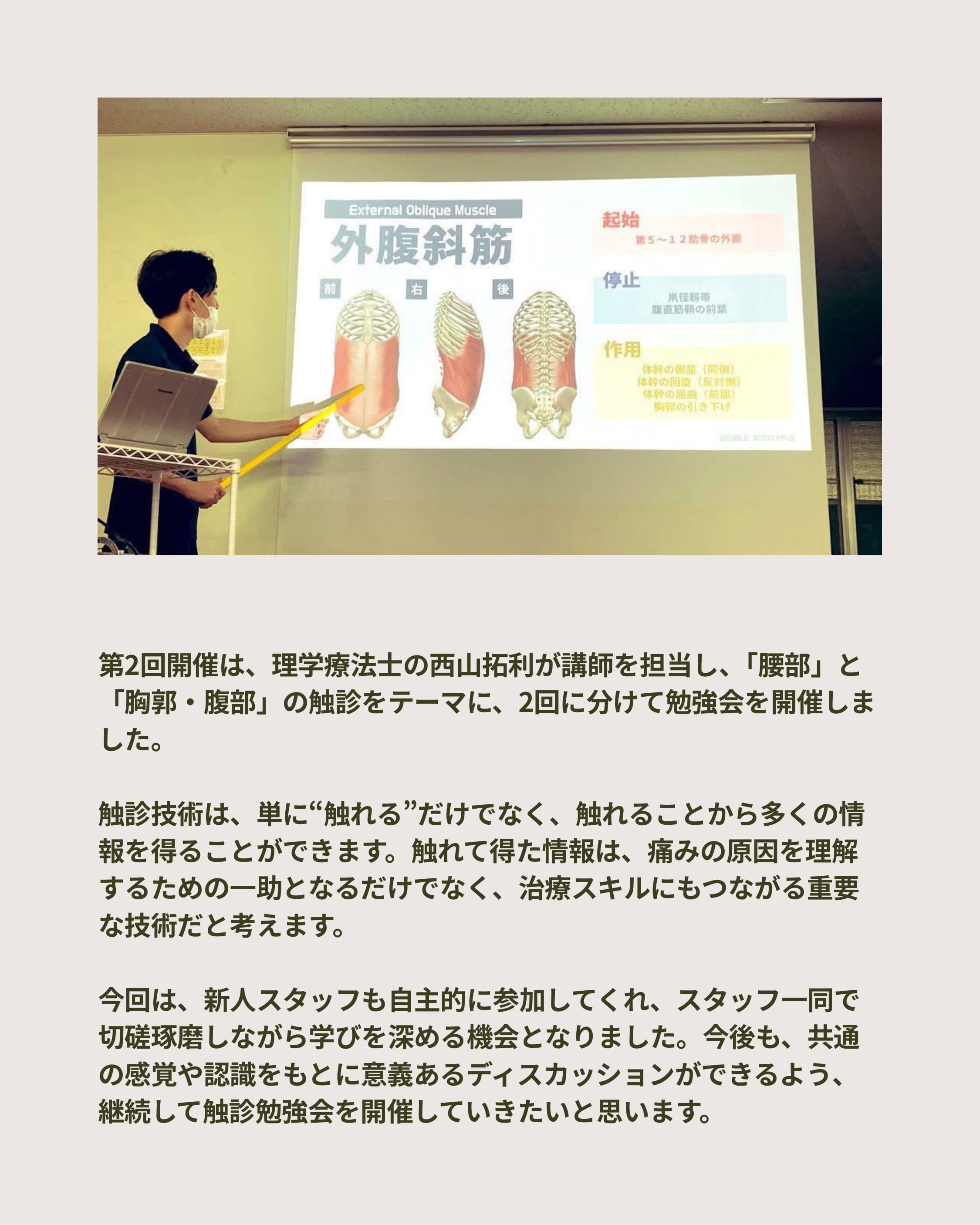 第2回開催は、理学療法士の西山拓利が講師を担当し、「腰部」と「胸郭・腹部」の触診をテーマに、2回に分けて勉強会を開催しました。