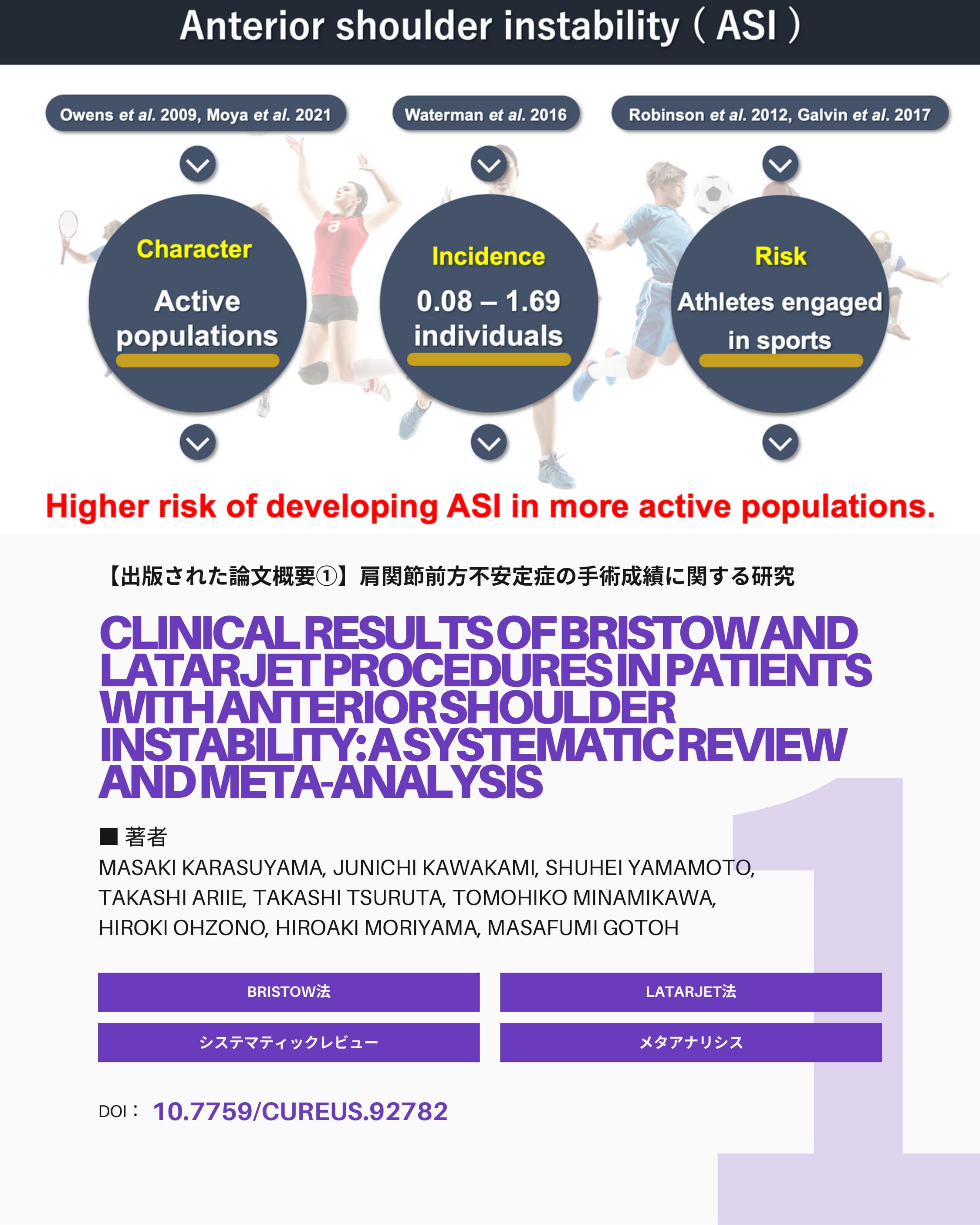 肩関節前方不安定症は、とくに活動性の高い患者において治療に難渋する病態であり、Bristow法およびLatarjet法はいずれも広く用いられてきました。本研究では、肩関節前方不安定症患者を対象として、両術式を比較したメタアナリシスを実施しました。その結果、不安定感の残存、スポーツ復帰率、骨癒合不全、合併症のいずれにおいても、両術式間に有意差は認められませんでした。また、肩関節機能スコアでは統計学的に有意な差がみられたものの、その差は臨床的に意味のある最小重要差には達していませんでした。以上より、現時点ではBristow法とLatarjet法の術後成績に明確な差があるとは結論づけられません。今後は、不安定感などの臨床症状に焦点を当てた臨床試験を通じて、術式選択に資するエビデンスの蓄積が求められます。