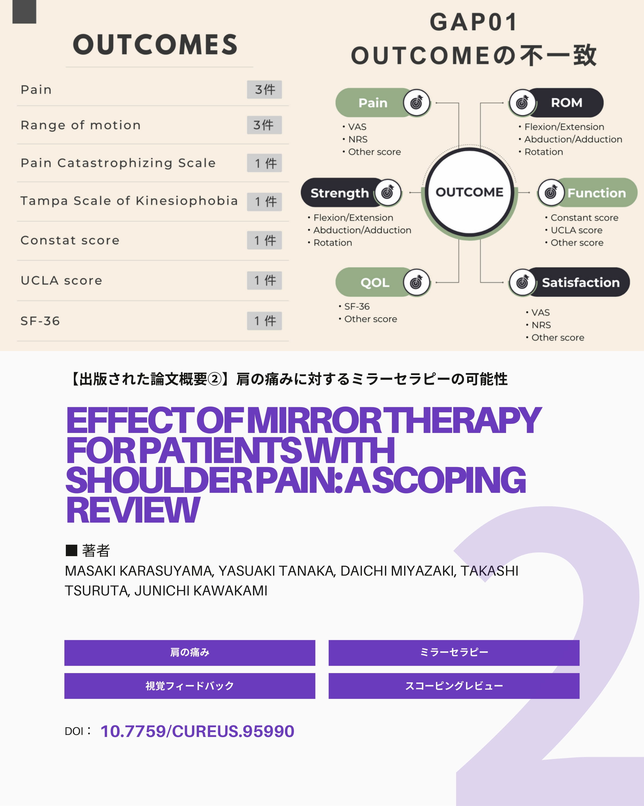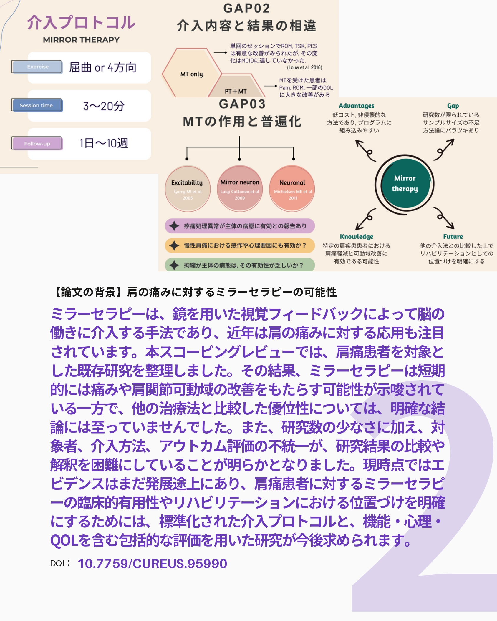 ミラーセラピーは、鏡を用いた視覚フィードバックによって脳の働きに介入する手法であり、近年は肩の痛みに対する応用も注目されています。本スコーピングレビューでは、肩痛患者を対象とした既存研究を整理しました。その結果、ミラーセラピーは短期的には痛みや肩関節可動域の改善をもたらす可能性が示唆されている一方で、他の治療法と比較した優位性については、明確な結論には至っていませんでした。また、研究数の少なさに加え、対象者、介入方法、アウトカム評価の不統一が、研究結果の比較や解釈を困難にしていることが明らかとなりました。現時点ではエビデンスはまだ発展途上にあり、肩痛患者に対するミラーセラピーの臨床的有用性やリハビリテーションにおける位置づけを明確にするためには、標準化された介入プロトコルと、機能・心理・QOLを含む包括的な評価を用いた研究が今後求められます。