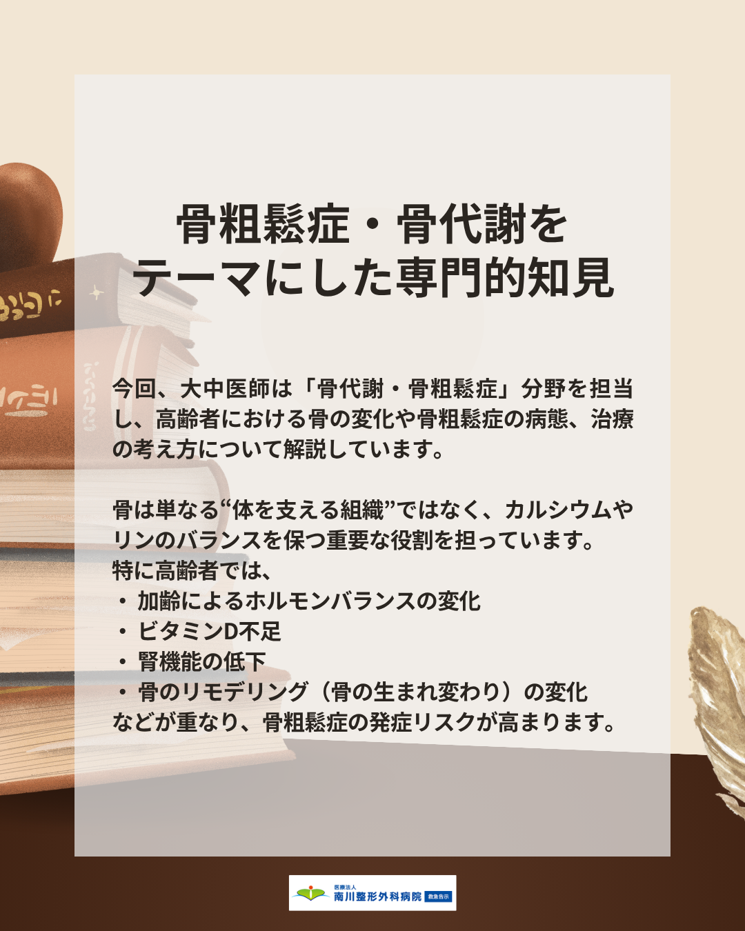 今回、大中医師は「骨代謝・骨粗鬆症」分野を担当し、高齢者における骨の変化や骨粗鬆症の病態、治療の考え方について解説しています。 骨は単なる“体を支える組織”ではなく、カルシウムやリンのバランスを保つ重要な役割を担っています。