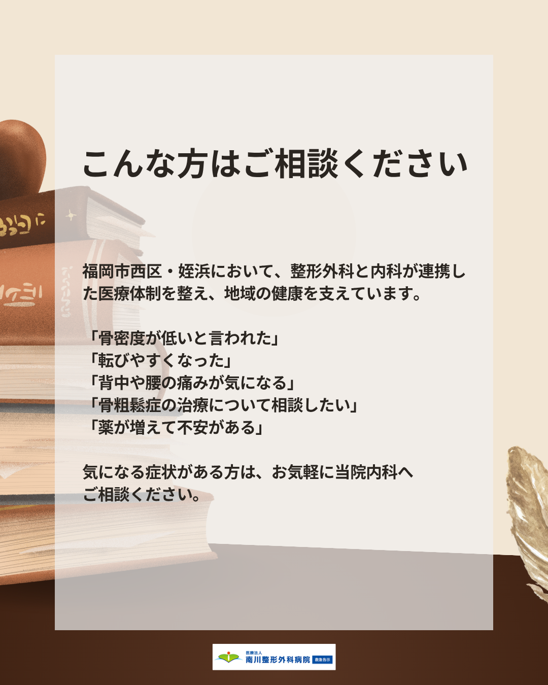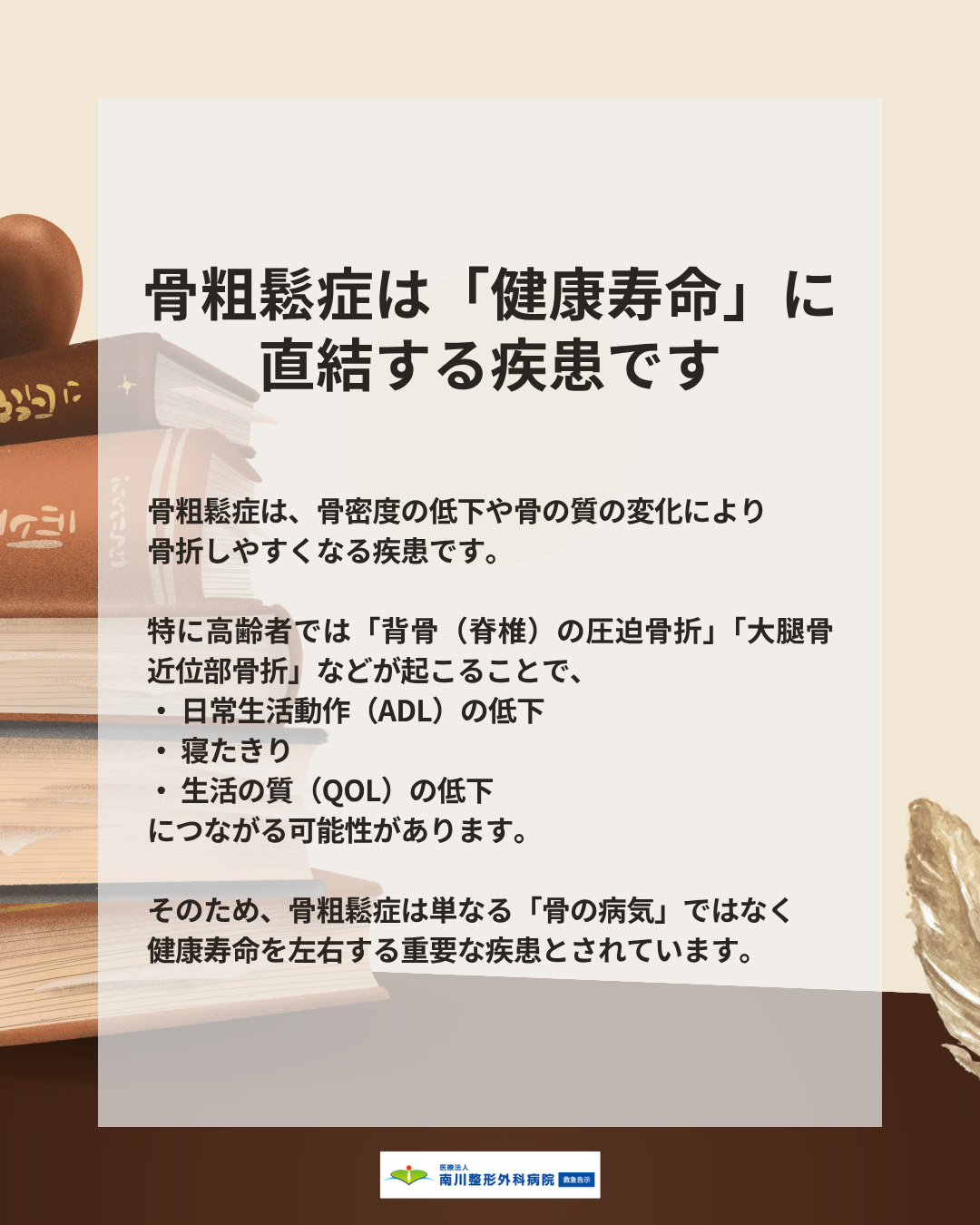 そのため、骨粗鬆症は単なる「骨の病気」ではなく、健康寿命を左右する重要な疾患とされています。