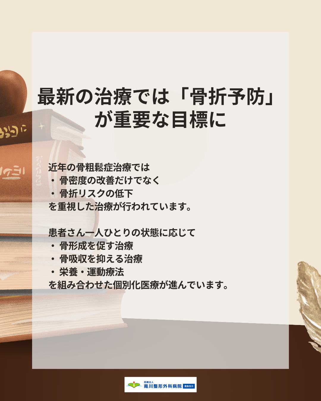 近年の骨粗鬆症治療では、「骨密度の改善だけでなく」「骨折リスクの低下」を重視した治療が行われています。患者さん一人ひとりの状態に応じて、
