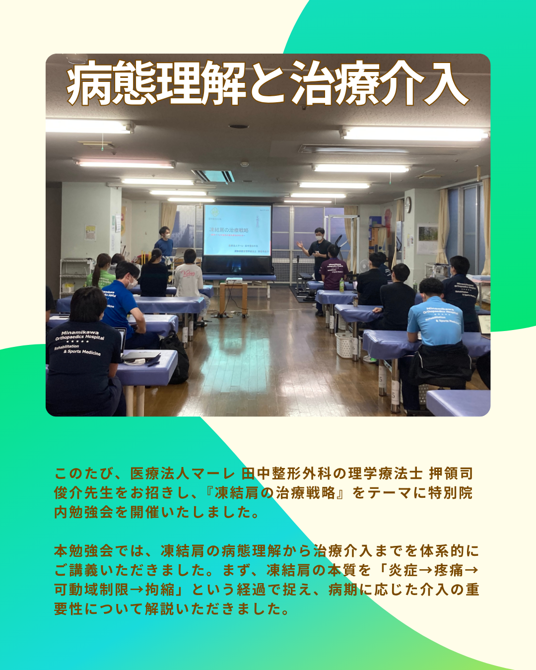 このたび、医療法人マーレ 田中整形外科の理学療法士 押領司 俊介先生をお招きし、『凍結肩の治療戦略』をテーマに特別院内勉強会を開催いたしました。