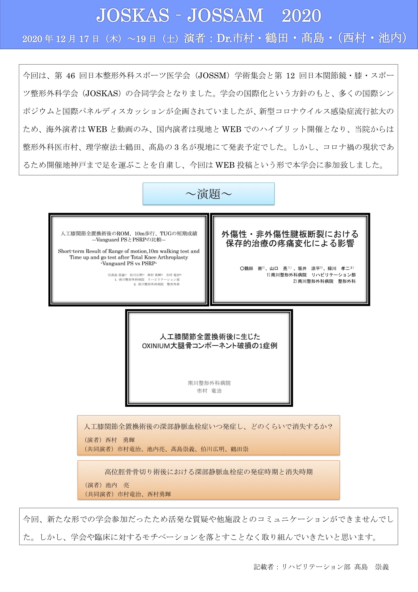 今回は、第46 回日本整形外科スポーツ医学会(JOSSM)学術集会と第12 回日本関節鏡・膝・スポーツ整形外科学会(JOSKAS)の合同学会となりました。学会の国際化という方針のもと、多くの国際シンポジウムと国際パネルディスカッションが企画されていましたが、新型コロナウイルス感染症流行拡大のため、海外演者はWEBと動画のみ、国内演者は現地とWEBでのハイブリット開催となり、当院からは整形外科医市村、理学療法士鶴田、髙島の3名が現地にて発表予定でした。しかし、コロナ禍の現状であるため開催地神戸まで足を運ぶことを自粛し、今回はWEB投稿という形で本学会に参加致しました。