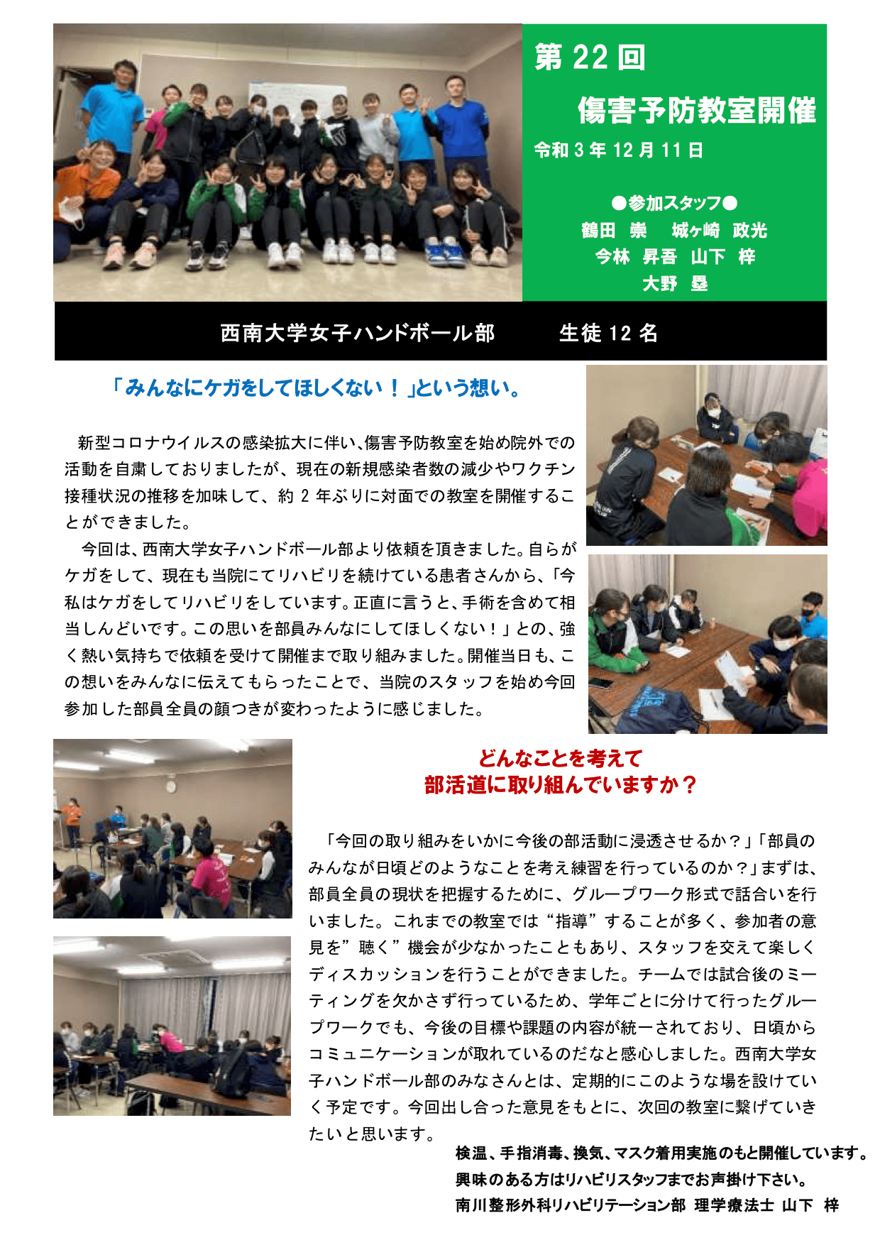 新型コロナウイルスの感染拡大に伴い、傷害予防教室を始め院外での活動を自粛しておりましたが、現在の新規感染者数の減少やワクチン接種状況の推移を加味して、約2年ぶりに対面での教室を開催することができました。今回は、西南大学女子ハンドボール部より依頼を頂きました。自らがケガをして、現在も当院にてリハビリを続けている患者さんから、「今私はケガをしてリハビリをしています。正直に言うと、手術を含めて相当しんどいです。この思いを部員みんなにしてほしくない!」との、強く熱い気持ちで依頼を受けて開催まで取り組みました。開催当日も、この想いをみんなに伝えてもらったことで、当院のスタッフを始め今回参加した部員全員の顔つきが変わったように感じました。