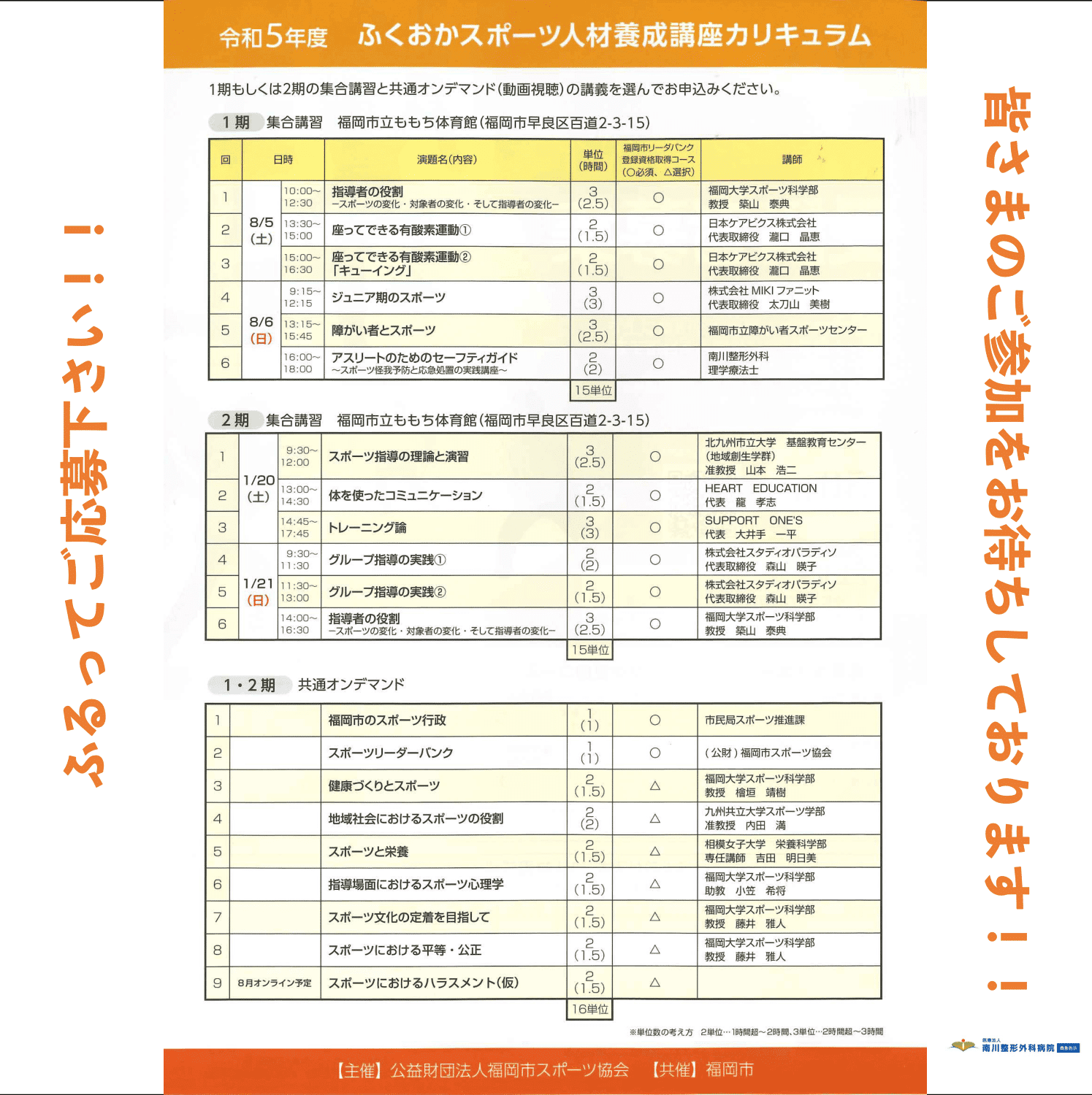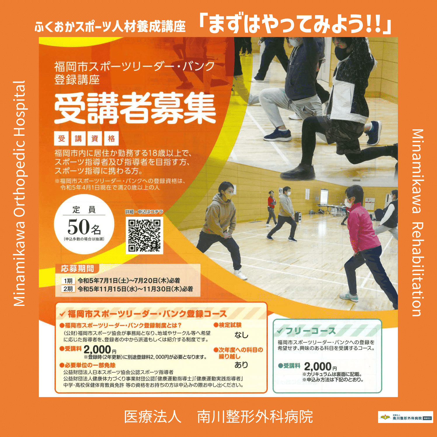 当院のスタッフが講師を務める「ふくおかスポーツ人材育成講座」の受講者募集が開始されました!本講座は、スポーツを楽しみながら学び、福岡市スポーツリーダー・バンクへの登録が可能となる講座です。また、スポーツリーダー・バンクへの登録を希望せず、ご自身の健康管理やトレーニングに関してなど、興味のある科目のみを受講することもできる講座になっています。