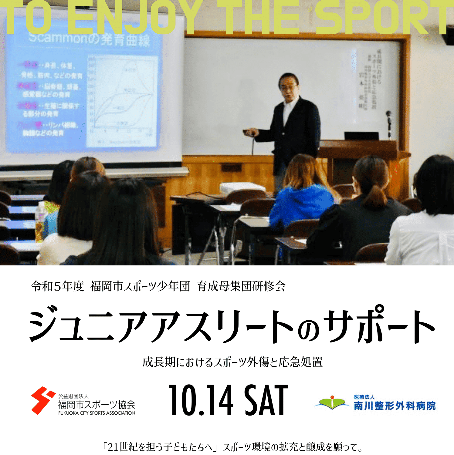 研修会では、福岡市スポーツ少年団に登録された団体の指導者と保護者を対象に、「ジュニアアスリート向けのケガ予防や応急処置」そして「成長期に発生する問題」に関する講義が行われました。子供たちがケガなくスポーツを楽しむためには、指導者と保護者のサポートが欠かせません。この研修会を通じて、子供たちに寄り添い、適切なサポートを提供できるような体制が整うことを願っています。これからも、福岡市のジュニアスポーツ推進、スポーツ文化の発展、そして活気ある社会づくりに貢献できるよう、取り組みを継続してまいります。