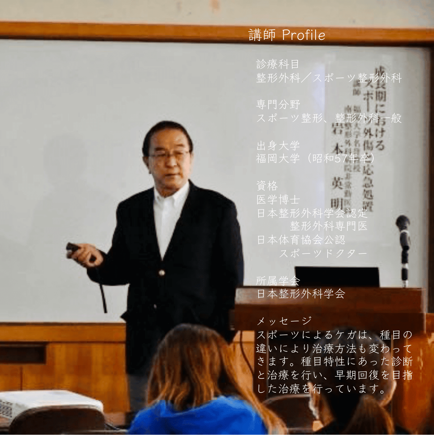 成長期におけるスポーツ外傷と応急処置に焦点を当て、福岡大学名誉教授であり南川整形外科病院非常勤医師である岩本英明氏を講師にお招きし、今年度の事業としてご講義いただきました。