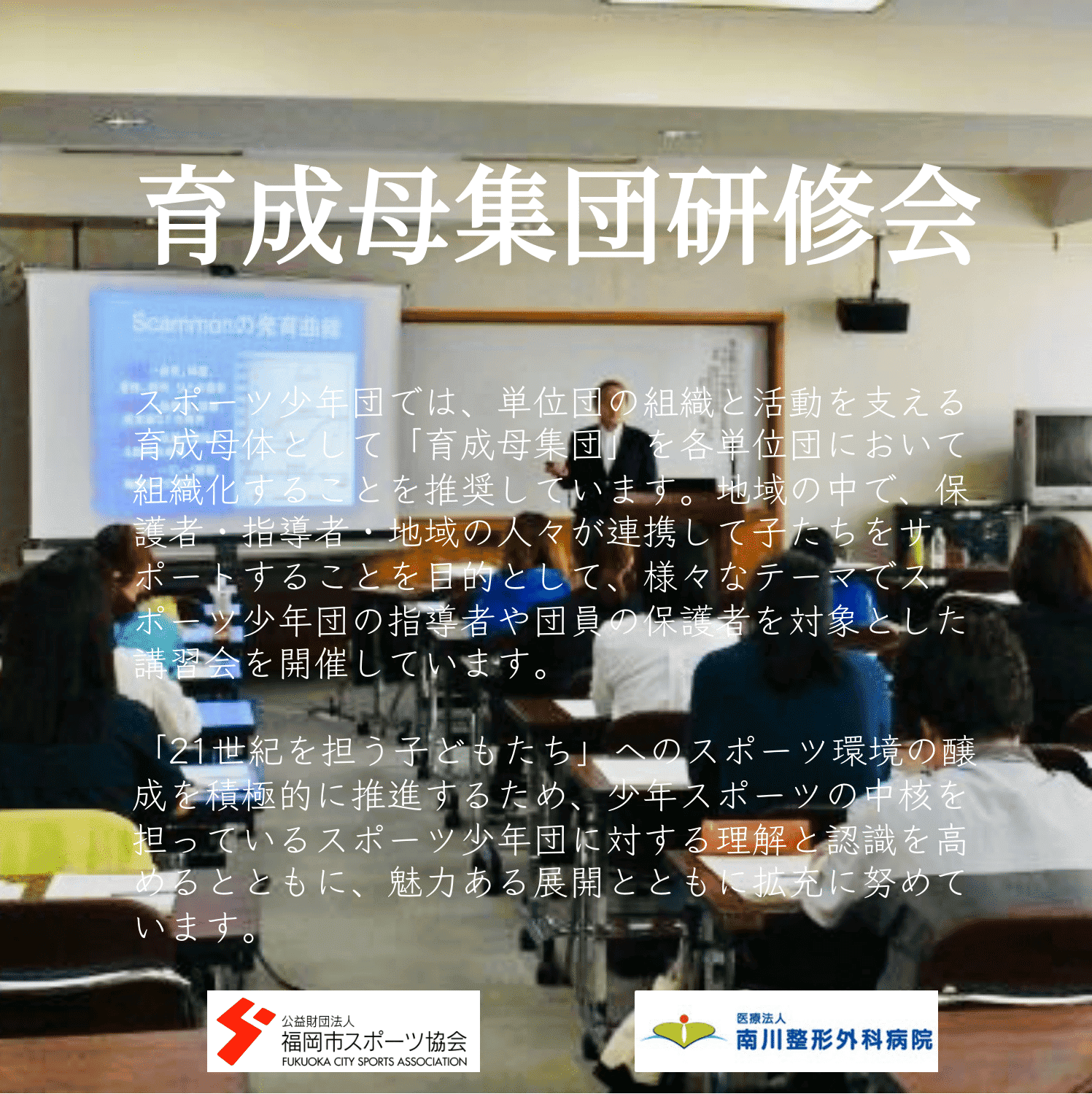 スポーツ少年団は、単位団の組織と活動を支える「育成母体」として、各単位団が「育成母集団」を組織化することを奨励しています。地域内で、保護者、指導者、地域の住民が協力し、子供たちをサポートすることを目的として、スポーツ少年団の指導者と保護者を対象に、さまざまなテーマで講習会を開催しています。私たちは「21世紀を担う子供たち」へのスポーツ環境の構築を積極的に推進し、少年スポーツの中心的存在であるスポーツ少年団に対する理解と認識を高め、魅力ある展開を推進するために尽力しています。