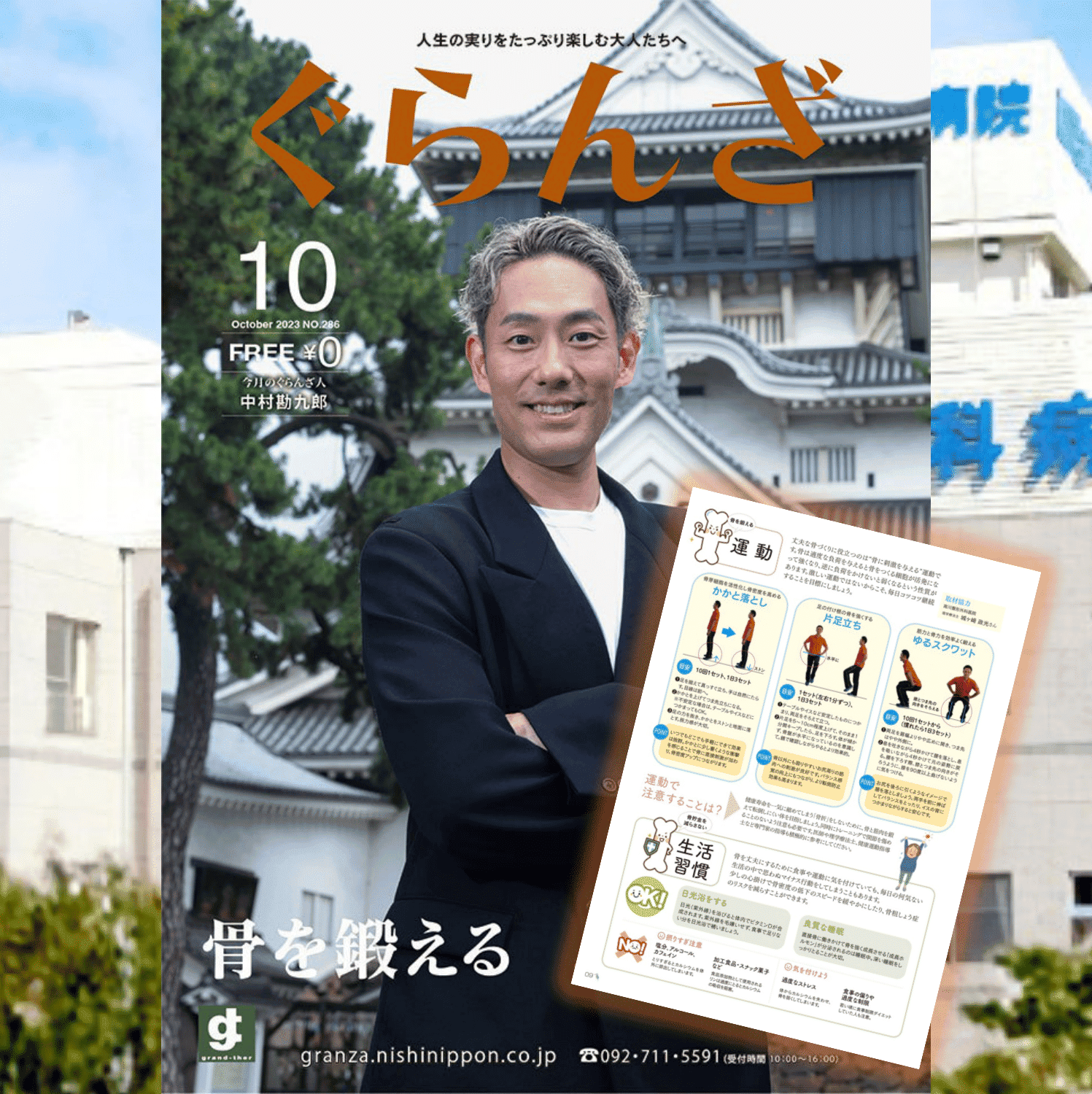 ぐらんざ10月号の巻頭企画「骨を鍛える」の特集に、当院が取材協力を行った記事が掲載されました。アクティブシニアにお届けする「大人のため」のフリーマガジン『ぐらんざ』では、ミドル・シニア世代の方々に健康的でアクティブな人生を歩めるようにと、正しい知識啓発や有益な情報発信が行われています。今回の特集では、「生涯、自分の足で歩ける体であり続けるために欠かせないのが「骨」の健康。今日から骨を鍛えましょう。」という趣旨の内容について、市民の方々の健康的な生活をサポート出来るような情報発信が掲載されています。ぜひお手に取ってご覧ください。